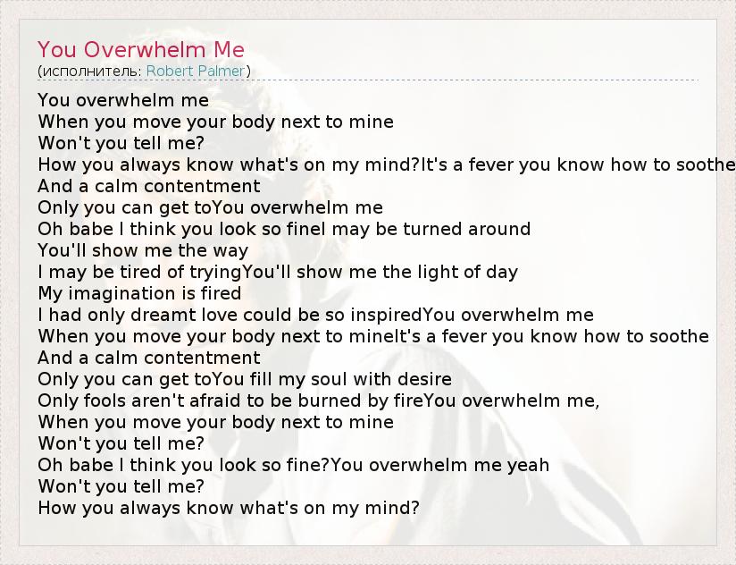 You overwhelm me When you move your body next to mine Won't you tell me? How you always know what's on my mind?It's a fever you know how to soothe And a calm contentment Only you can get toYou overwhelm me Oh babe I think you look so fineI may be turned around You'll show me the way I may be tired of tryingYou'll show me the light of day My imagination is fired I had only dreamt love could be so inspiredYou overwhelm me When you move your body next to mineIt's a fever you know how to soothe And a calm contentment Only you can get toYou fill my soul with desire Only fools aren't afraid to be burned by fireYou overwhelm me, When you move your body next to mine Won't you tell me? Oh babe I think you look so fine?You overwhelm me yeah Won't you tell me? How you always know what's on my mind?
