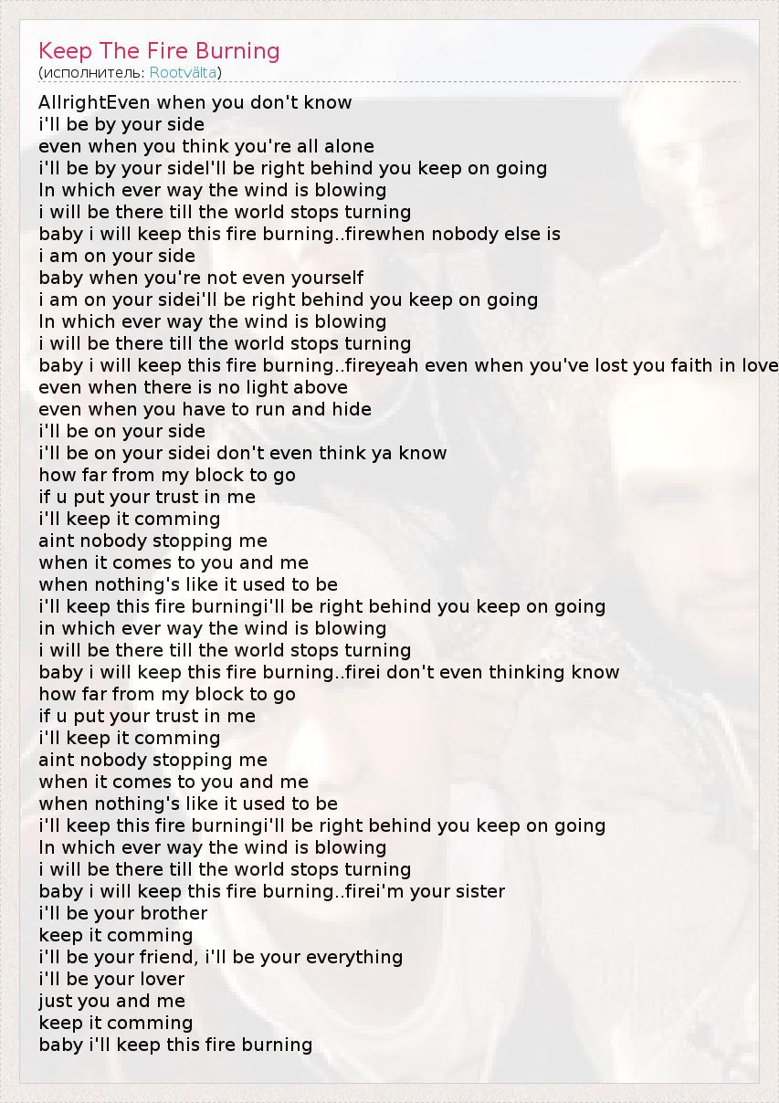 AllrightEven when you don't know i'll be by your side even when you think you're all alone i'll be by your sideI'll be right behind you keep on going In which ever way the wind is blowing i will be there till the world stops turning baby i will keep this fire burning..firewhen nobody else is i am on your side baby when you're not even yourself i am on your sidei'll be right behind you keep on going In which ever way the wind is blowing i will be there till the world stops turning baby i will keep this fire burning..fireyeah even when you've lost you faith in love even when there is no light above even when you have to run and hide i'll be on your side i'll be on your sidei don't even think ya know how far from my block to go if u put your trust in me i'll keep it comming aint nobody stopping me when it comes to you and me when nothing's like it used to be i'll keep this fire burningi'll be right behind you keep on going in which ever way the wind is blowing i will be there till the world stops turning baby i will keep this fire burning..firei don't even thinking know how far from my block to go if u put your trust in me i'll keep it comming aint nobody stopping me when it comes to you and me when nothing's like it used to be i'll keep this fire burningi'll be right behind you keep on going In which ever way the wind is blowing i will be there till the world stops turning baby i will keep this fire burning..firei'm your sister i'll be your brother keep it comming i'll be your friend, i'll be your everything i'll be your lover just you and me keep it comming baby i'll keep this fire burning