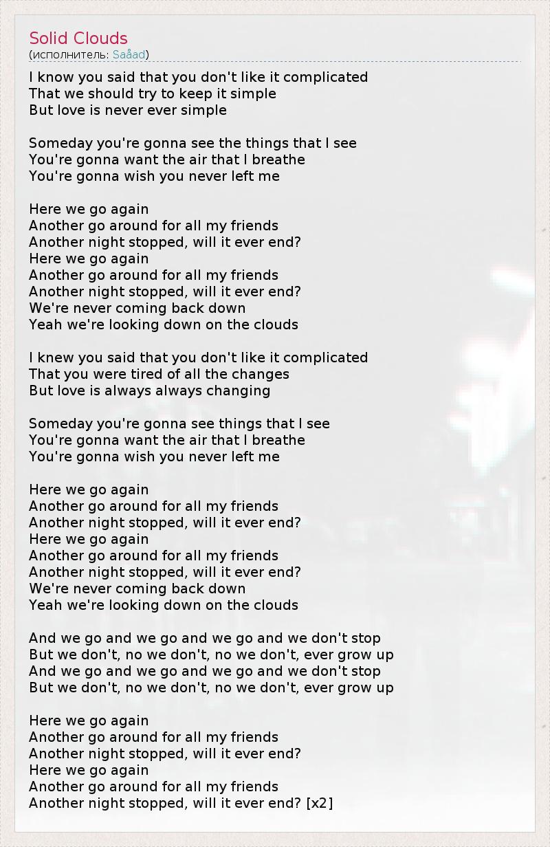 I know you said that you don't like it complicated That we should try to keep it simple But love is never ever simple Someday you're gonna see the things that I see You're gonna want the air that I breathe You're gonna wish you never left me Here we go again Another go around for all my friends Another night stopped, will it ever end? Here we go again Another go around for all my friends Another night stopped, will it ever end? We're never coming back down Yeah we're looking down on the clouds I knew you said that you don't like it complicated That you were tired of all the changes But love is always always changing Someday you're gonna see things that I see You're gonna want the air that I breathe You're gonna wish you never left me Here we go again Another go around for all my friends Another night stopped, will it ever end? Here we go again Another go around for all my friends Another night stopped, will it ever end? We're never coming back down Yeah we're looking down on the clouds And we go and we go and we go and we don't stop But we don't, no we don't, no we don't, ever grow up And we go and we go and we go and we don't stop But we don't, no we don't, no we don't, ever grow up Here we go again Another go around for all my friends Another night stopped, will it ever end? Here we go again Another go around for all my friends Another night stopped, will it ever end? [x2]