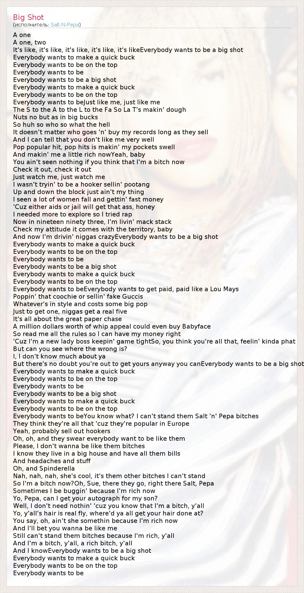 Это интересно:Напомню сразу, что SALT’N’PEPA — это женское трио из Америки.Cheryl ‘Salt’ James родом из нью–йоркского района Бруклин. Sandy‘Pepa’ Denton (р. 9.10.1969 г.) родилась на Ямайке, но росла также в Нью–Йорке (район Куинс). Обе семьи были многодетными.Дамочки познакомились в колледже, затем окончания которого могли начинать воспитателями в детском саду. Обе стали подрабатывать в супермаркете под названием... продолжение