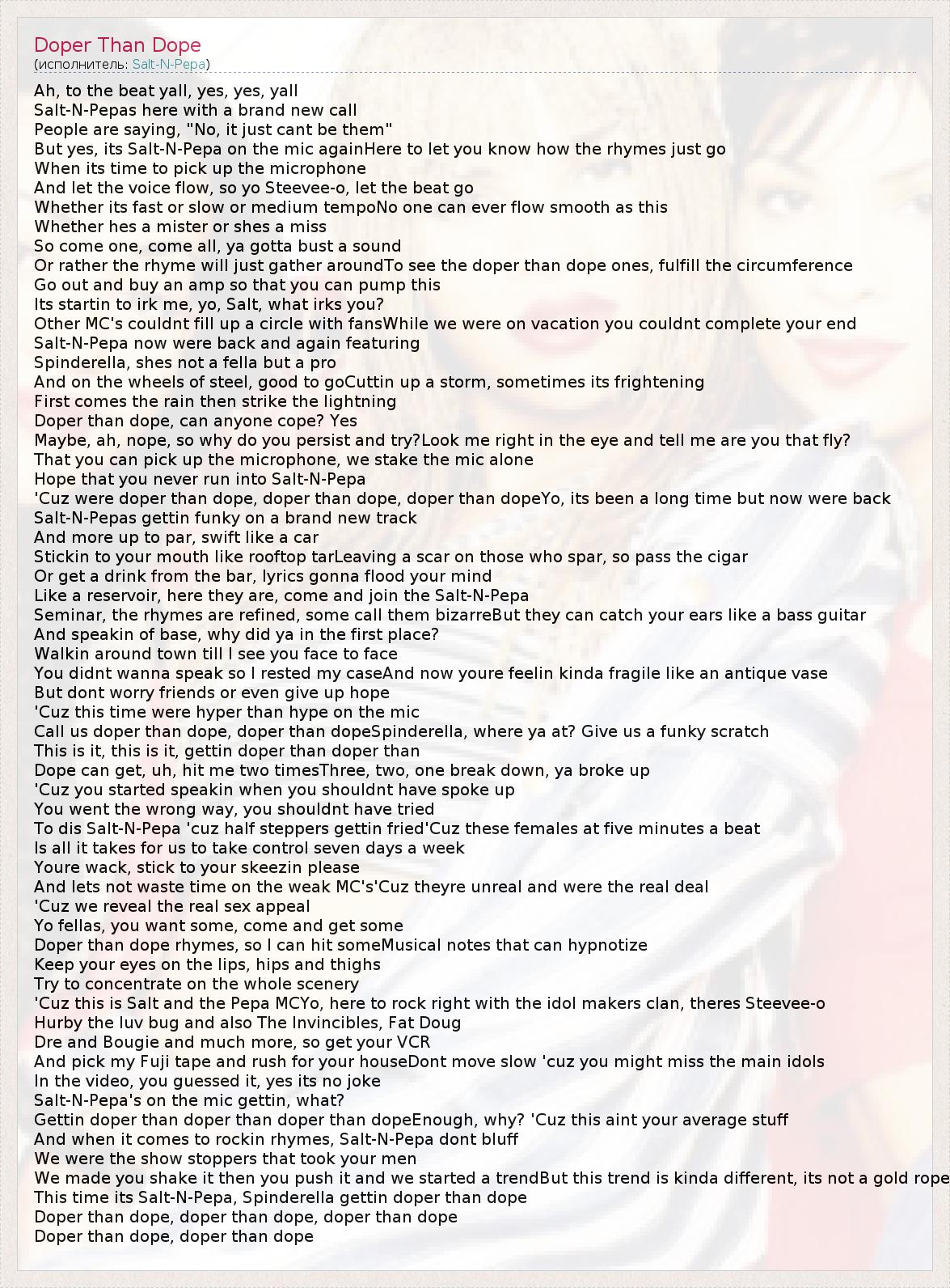 Ah, to the beat yall, yes, yes, yall Salt-N-Pepas here with a brand new call People are saying, "No, it just cant be them" But yes, its Salt-N-Pepa on the mic againHere to let you know how the rhymes just go When its time to pick up the microphone And let the voice flow, so yo Steevee-o, let the beat go Whether its fast or slow or medium tempoNo one can ever flow smooth as this Whether hes a mister or shes a miss So come one, come all, ya gotta bust a sound Or rather the rhyme will just gather aroundTo see the doper than dope ones, fulfill the circumference Go out and buy an amp so that you can pump this Its startin to irk me, yo, Salt, what irks you? Other MC's couldnt fill up a circle with fansWhile we were on vacation you couldnt complete your end Salt-N-Pepa now were back and again featuring Spinderella, shes not a fella but a pro And on the wheels of steel, good to goCuttin up a storm, sometimes its frightening First comes the rain then strike the lightning Doper than dope, can anyone cope? Yes Maybe, ah, nope, so why do you persist and try?Look me right in the eye and tell me are you that fly? That you can pick up the microphone, we stake the mic alone Hope that you never run into Salt-N-Pepa 'Cuz were doper than dope, doper than dope, doper than dopeYo, its been a long time but now were back Salt-N-Pepas gettin funky on a brand new track And more up to par, swift like a car Stickin to your mouth like rooftop tarLeaving a scar on those who spar, so pass the cigar Or get a drink from the bar, lyrics gonna flood your mind Like a reservoir, here they are, come and join the Salt-N-Pepa Seminar, the rhymes are refined, some call them bizarreBut they can catch your ears like a bass guitar And speakin of base, why did ya in the first place? Walkin around town till I see you face to face You didnt wanna speak so I rested my caseAnd now youre feelin kinda fragile like an antique vase But dont worry friends or even give up hope 'Cuz this time were hyper than hype on the mic Call us doper than dope, doper than dopeSpinderella, where ya at? Give us a funky scratch This is it, this is it, gettin doper than doper than Dope can get, uh, hit me two timesThree, two, one break down, ya broke up 'Cuz you started speakin when you shouldnt have spoke up You went the wrong way, you shouldnt have tried To dis Salt-N-Pepa 'cuz half steppers gettin fried'Cuz these females at five minutes a beat Is all it takes for us to take control seven days a week Youre wack, stick to your skeezin please And lets not waste time on the weak MC's'Cuz theyre unreal and were the real deal 'Cuz we reveal the real sex appeal Yo fellas, you want some, come and get some Doper than dope rhymes, so I can hit someMusical notes that can hypnotize Keep your eyes on the lips, hips and thighs Try to concentrate on the whole scenery 'Cuz this is Salt and the Pepa MCYo, here to rock right with the idol makers clan, theres Steevee-o Hurby the luv bug and also The Invincibles, Fat Doug Dre and Bougie and much more, so get your VCR And pick my Fuji tape and rush for your houseDont move slow 'cuz you might miss the main idols In the video, you guessed it, yes its no joke Salt-N-Pepa's on the mic gettin, what? Gettin doper than doper than doper than dopeEnough, why? 'Cuz this aint your average stuff And when it comes to rockin rhymes, Salt-N-Pepa dont bluff We were the show stoppers that took your men We made you shake it then you push it and we started a trendBut this trend is kinda different, its not a gold rope This time its Salt-N-Pepa, Spinderella gettin doper than dope Doper than dope, doper than dope, doper than dope Doper than dope, doper than dope