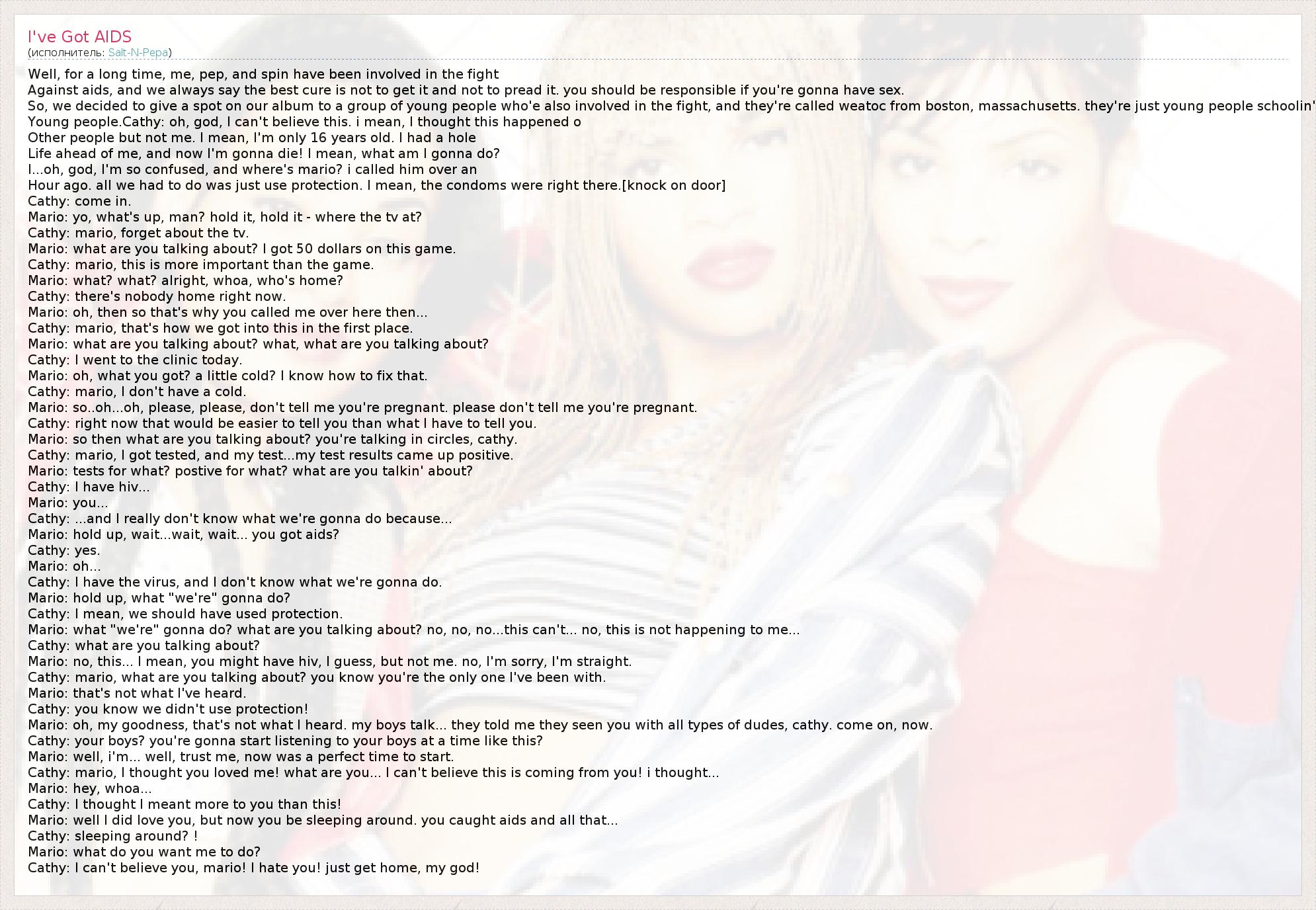 Well, for a long time, me, pep, and spin have been involved in the fight Against aids, and we always say the best cure is not to get it and not to pread it. you should be responsible if you're gonna have sex. So, we decided to give a spot on our album to a group of young people who'e also involved in the fight, and they're called weatoc from boston, massachusetts. they're just young people schoolin' Young people.Cathy: oh, god, I can't believe this. i mean, I thought this happened o Other people but not me. I mean, I'm only 16 years old. I had a hole Life ahead of me, and now I'm gonna die! I mean, what am I gonna do? I...oh, god, I'm so confused, and where's mario? i called him over an Hour ago. all we had to do was just use protection. I mean, the condoms were right there.[knock on door] Cathy: come in. Mario: yo, what's up, man? hold it, hold it - where the tv at? Cathy: mario, forget about the tv. Mario: what are you talking about? I got 50 dollars on this game. Cathy: mario, this is more important than the game. Mario: what? what? alright, whoa, who's home? Cathy: there's nobody home right now. Mario: oh, then so that's why you called me over here then... Cathy: mario, that's how we got into this in the first place. Mario: what are you talking about? what, what are you talking about? Cathy: I went to the clinic today. Mario: oh, what you got? a little cold? I know how to fix that. Cathy: mario, I don't have a cold. Mario: so..oh...oh, please, please, don't tell me you're pregnant. please don't tell me you're pregnant. Cathy: right now that would be easier to tell you than what I have to tell you. Mario: so then what are you talking about? you're talking in circles, cathy. Cathy: mario, I got tested, and my test...my test results came up positive. Mario: tests for what? postive for what? what are you talkin' about? Cathy: I have hiv... Mario: you... Cathy: ...and I really don't know what we're gonna do because... Mario: hold up, wait...wait, wait... you got aids? Cathy: yes. Mario: oh... Cathy: I have the virus, and I don't know what we're gonna do. Mario: hold up, what "we're" gonna do? Cathy: I mean, we should have used protection. Mario: what "we're" gonna do? what are you talking about? no, no, no...this can't... no, this is not happening to me... Cathy: what are you talking about? Mario: no, this... I mean, you might have hiv, I guess, but not me. no, I'm sorry, I'm straight. Cathy: mario, what are you talking about? you know you're the only one I've been with. Mario: that's not what I've heard. Cathy: you know we didn't use protection! Mario: oh, my goodness, that's not what I heard. my boys talk... they told me they seen you with all types of dudes, cathy. come on, now. Cathy: your boys? you're gonna start listening to your boys at a time like this? Mario: well, i'm... well, trust me, now was a perfect time to start. Cathy: mario, I thought you loved me! what are you... I can't believe this is coming from you! i thought... Mario: hey, whoa... Cathy: I thought I meant more to you than this! Mario: well I did love you, but now you be sleeping around. you caught aids and all that... Cathy: sleeping around? ! Mario: what do you want me to do? Cathy: I can't believe you, mario! I hate you! just get home, my god!