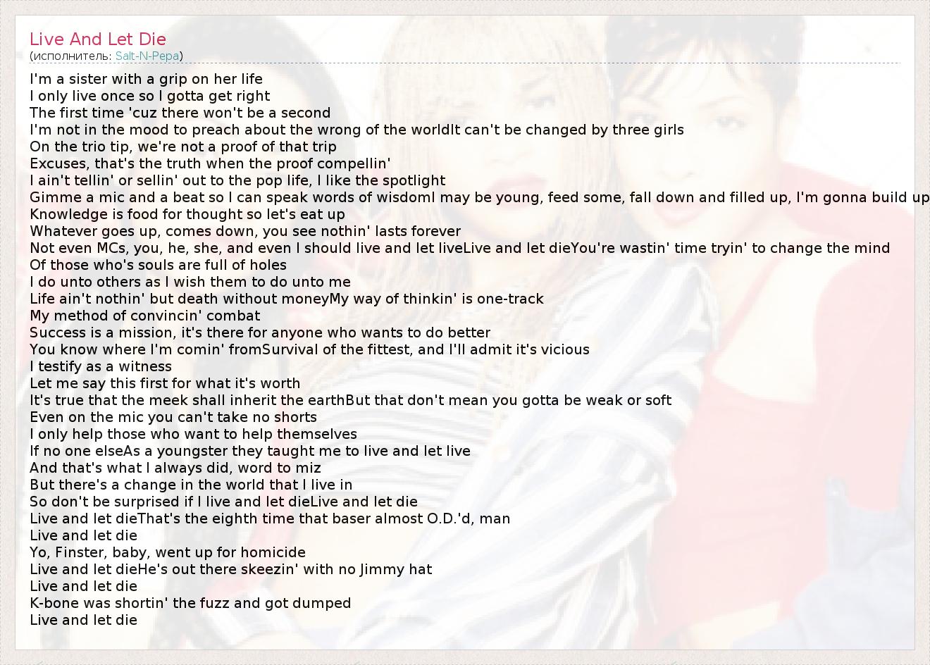 I'm a sister with a grip on her life I only live once so I gotta get right The first time 'cuz there won't be a second I'm not in the mood to preach about the wrong of the worldIt can't be changed by three girls On the trio tip, we're not a proof of that trip Excuses, that's the truth when the proof compellin' I ain't tellin' or sellin' out to the pop life, I like the spotlight Gimme a mic and a beat so I can speak words of wisdomI may be young, feed some, fall down and filled up, I'm gonna build up Knowledge is food for thought so let's eat up Whatever goes up, comes down, you see nothin' lasts forever Not even MCs, you, he, she, and even I should live and let liveLive and let dieYou're wastin' time tryin' to change the mind Of those who's souls are full of holes I do unto others as I wish them to do unto me Life ain't nothin' but death without moneyMy way of thinkin' is one-track My method of convincin' combat Success is a mission, it's there for anyone who wants to do better You know where I'm comin' fromSurvival of the fittest, and I'll admit it's vicious I testify as a witness Let me say this first for what it's worth It's true that the meek shall inherit the earthBut that don't mean you gotta be weak or soft Even on the mic you can't take no shorts I only help those who want to help themselves If no one elseAs a youngster they taught me to live and let live And that's what I always did, word to miz But there's a change in the world that I live in So don't be surprised if I live and let dieLive and let die Live and let dieThat's the eighth time that baser almost O.D.'d, man Live and let die Yo, Finster, baby, went up for homicide Live and let dieHe's out there skeezin' with no Jimmy hat Live and let die K-bone was shortin' the fuzz and got dumped Live and let die