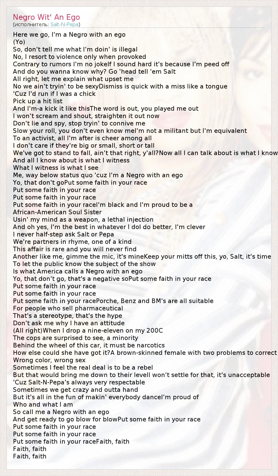 Here we go, I'm a Negro with an ego (Yo) So, don't tell me what I'm doin' is illegal No, I resort to violence only when provoked Contrary to rumors I'm no jokeIf I sound hard it's because I'm peed off And do you wanna know why? Go 'head tell 'em Salt All right, let me explain what upset me No we ain't tryin' to be sexyDismiss is quick with a miss like a tongue 'Cuz I'd run if I was a chick Pick up a hit list And I'm-a kick it like thisThe word is out, you played me out I won't scream and shout, straighten it out now Don't lie and spy, stop tryin' to connive me Slow your roll, you don't even know meI'm not a militant but I'm equivalent To an activist, all I'm after is cheer among all I don't care if they're big or small, short or tall We've got to stand to fall, ain't that right, y'all?Now all I can talk about is what I know And all I know about is what I witness What I witness is what I see Me, way below status quo 'cuz I'm a Negro with an ego Yo, that don't goPut some faith in your race Put some faith in your race Put some faith in your race Put some faith in your raceI'm black and I'm proud to be a African-American Soul Sister Usin' my mind as a weapon, a lethal injection And oh yes, I'm the best in whatever I doI do better, I'm clever I never half-step ask Salt or Pepa We're partners in rhyme, one of a kind This affair is rare and you will never find Another like me, gimme the mic, it's mineKeep your mitts off this, yo, Salt, it's time To let the public know the subject of the show Is what America calls a Negro with an ego Yo, that don't go, that's a negative soPut some faith in your race Put some faith in your race Put some faith in your race Put some faith in your racePorche, Benz and BM's are all suitable For people who sell pharmaceutical That's a stereotype, that's the hype Don't ask me why I have an attitude (All right)When I drop a nine-eleven on my 200C The cops are surprised to see, a minority Behind the wheel of this car, it must be narcotics How else could she have got it?A brown-skinned female with two problems to correct Wrong color, wrong sex Sometimes I feel the real deal is to be a rebel But that would bring me down to their levelI won't settle for that, it's unacceptable 'Cuz Salt-N-Pepa's always very respectable Sometimes we get crazy and outta hand But it's all in the fun of makin' everybody danceI'm proud of Who and what I am So call me a Negro with an ego And get ready to go blow for blowPut some faith in your race Put some faith in your race Put some faith in your race Put some faith in your raceFaith, faith Faith, faith Faith, faith