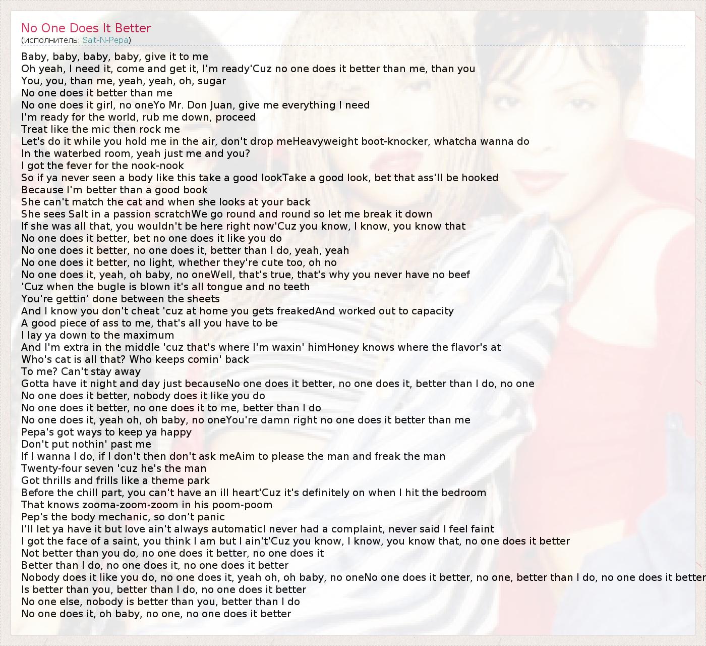 Baby, baby, baby, baby, give it to me Oh yeah, I need it, come and get it, I'm ready'Cuz no one does it better than me, than you You, you, than me, yeah, yeah, oh, sugar No one does it better than me No one does it girl, no oneYo Mr. Don Juan, give me everything I need I'm ready for the world, rub me down, proceed Treat like the mic then rock me Let's do it while you hold me in the air, don't drop meHeavyweight boot-knocker, whatcha wanna do In the waterbed room, yeah just me and you? I got the fever for the nook-nook So if ya never seen a body like this take a good lookTake a good look, bet that ass'll be hooked Because I'm better than a good book She can't match the cat and when she looks at your back She sees Salt in a passion scratchWe go round and round so let me break it down If she was all that, you wouldn't be here right now'Cuz you know, I know, you know that No one does it better, bet no one does it like you do No one does it better, no one does it, better than I do, yeah, yeah No one does it better, no light, whether they're cute too, oh no No one does it, yeah, oh baby, no oneWell, that's true, that's why you never have no beef 'Cuz when the bugle is blown it's all tongue and no teeth You're gettin' done between the sheets And I know you don't cheat 'cuz at home you gets freakedAnd worked out to capacity A good piece of ass to me, that's all you have to be I lay ya down to the maximum And I'm extra in the middle 'cuz that's where I'm waxin' himHoney knows where the flavor's at Who's cat is all that? Who keeps comin' back To me? Can't stay away Gotta have it night and day just becauseNo one does it better, no one does it, better than I do, no one No one does it better, nobody does it like you do No one does it better, no one does it to me, better than I do No one does it, yeah oh, oh baby, no oneYou're damn right no one does it better than me Pepa's got ways to keep ya happy Don't put nothin' past me If I wanna I do, if I don't then don't ask meAim to please the man and freak the man Twenty-four seven 'cuz he's the man Got thrills and frills like a theme park Before the chill part, you can't have an ill heart'Cuz it's definitely on when I hit the bedroom That knows zooma-zoom-zoom in his poom-poom Pep's the body mechanic, so don't panic I'll let ya have it but love ain't always automaticI never had a complaint, never said I feel faint I got the face of a saint, you think I am but I ain't'Cuz you know, I know, you know that, no one does it better Not better than you do, no one does it better, no one does it Better than I do, no one does it, no one does it better Nobody does it like you do, no one does it, yeah oh, oh baby, no oneNo one does it better, no one, better than I do, no one does it better Is better than you, better than I do, no one does it better No one else, nobody is better than you, better than I do No one does it, oh baby, no one, no one does it better