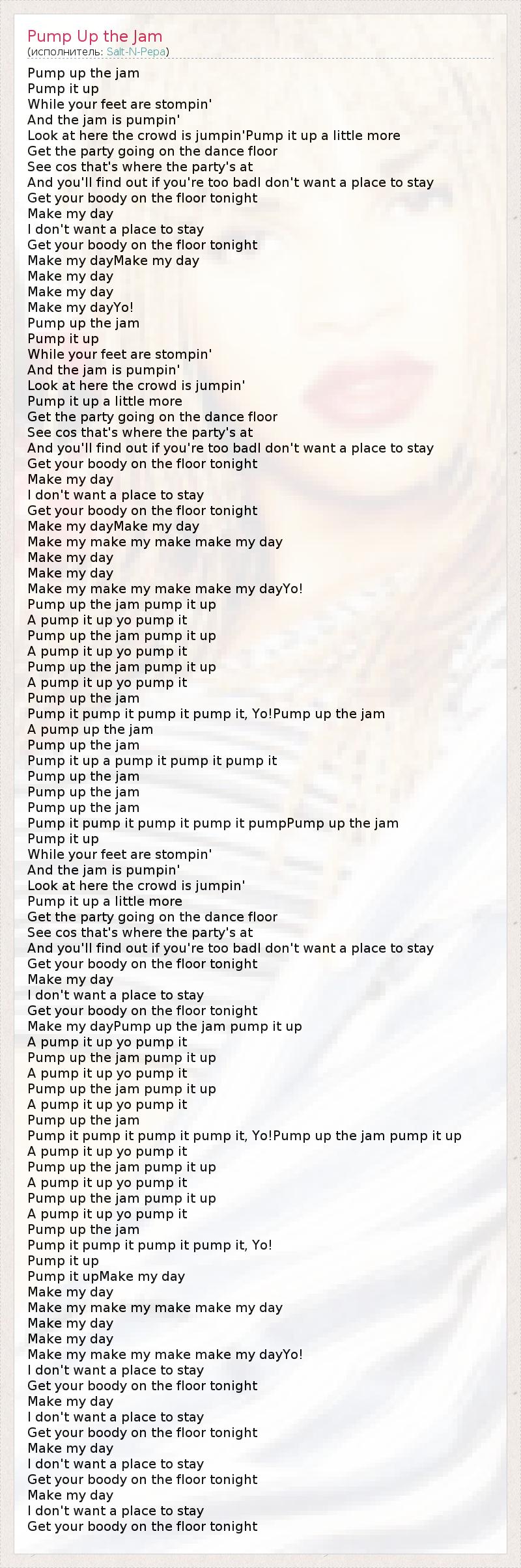 Pump up the jam Pump it up While your feet are stompin' And the jam is pumpin' Look at here the crowd is jumpin'Pump it up a little more Get the party going on the dance floor See cos that's where the party's at And you'll find out if you're too badI don't want a place to stay Get your boody on the floor tonight Make my day I don't want a place to stay Get your boody on the floor tonight Make my dayMake my day Make my day Make my day Make my dayYo! Pump up the jam Pump it up While your feet are stompin' And the jam is pumpin' Look at here the crowd is jumpin' Pump it up a little more Get the party going on the dance floor See cos that's where the party's at And you'll find out if you're too badI don't want a place to stay Get your boody on the floor tonight Make my day I don't want a place to stay Get your boody on the floor tonight Make my dayMake my day Make my make my make make my day Make my day Make my day Make my make my make make my dayYo! Pump up the jam pump it up A pump it up yo pump it Pump up the jam pump it up A pump it up yo pump it Pump up the jam pump it up A pump it up yo pump it Pump up the jam Pump it pump it pump it pump it, Yo!Pump up the jam A pump up the jam Pump up the jam Pump it up a pump it pump it pump it Pump up the jam Pump up the jam Pump up the jam Pump it pump it pump it pump it pumpPump up the jam Pump it up While your feet are stompin' And the jam is pumpin' Look at here the crowd is jumpin' Pump it up a little more Get the party going on the dance floor See cos that's where the party's at And you'll find out if you're too badI don't want a place to stay Get your boody on the floor tonight Make my day I don't want a place to stay Get your boody on the floor tonight Make my dayPump up the jam pump it up A pump it up yo pump it Pump up the jam pump it up A pump it up yo pump it Pump up the jam pump it up A pump it up yo pump it Pump up the jam Pump it pump it pump it pump it, Yo!Pump up the jam pump it up A pump it up yo pump it Pump up the jam pump it up A pump it up yo pump it Pump up the jam pump it up A pump it up yo pump it Pump up the jam Pump it pump it pump it pump it, Yo! Pump it up Pump it upMake my day Make my day Make my make my make make my day Make my day Make my day Make my make my make make my dayYo! I don't want a place to stay Get your boody on the floor tonight Make my day I don't want a place to stay Get your boody on the floor tonight Make my day I don't want a place to stay Get your boody on the floor tonight Make my day I don't want a place to stay Get your boody on the floor tonight