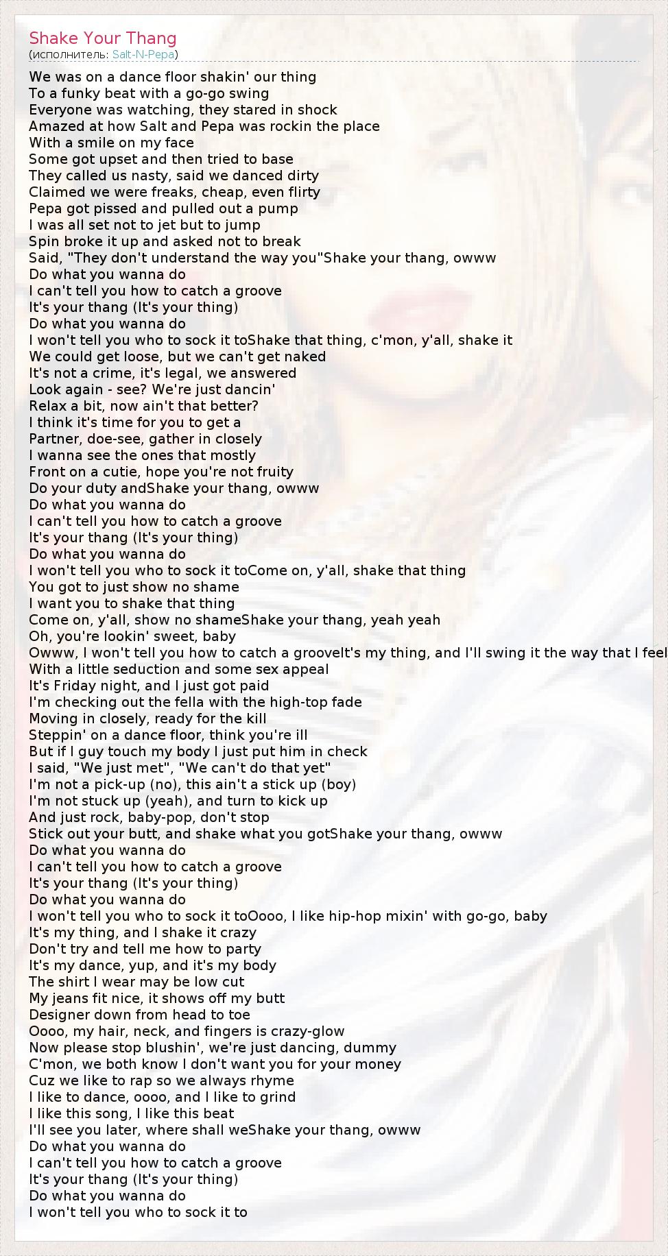 We was on a dance floor shakin' our thing To a funky beat with a go-go swing Everyone was watching, they stared in shock Amazed at how Salt and Pepa was rockin the place With a smile on my face Some got upset and then tried to base They called us nasty, said we danced dirty Claimed we were freaks, cheap, even flirty Pepa got pissed and pulled out a pump I was all set not to jet but to jump Spin broke it up and asked not to break Said, "They don't understand the way you"Shake your thang, owww Do what you wanna do I can't tell you how to catch a groove It's your thang (It's your thing) Do what you wanna do I won't tell you who to sock it toShake that thing, c'mon, y'all, shake it We could get loose, but we can't get naked It's not a crime, it's legal, we answered Look again - see? We're just dancin' Relax a bit, now ain't that better? I think it's time for you to get a Partner, doe-see, gather in closely I wanna see the ones that mostly Front on a cutie, hope you're not fruity Do your duty andShake your thang, owww Do what you wanna do I can't tell you how to catch a groove It's your thang (It's your thing) Do what you wanna do I won't tell you who to sock it toCome on, y'all, shake that thing You got to just show no shame I want you to shake that thing Come on, y'all, show no shameShake your thang, yeah yeah Oh, you're lookin' sweet, baby Owww, I won't tell you how to catch a grooveIt's my thing, and I'll swing it the way that I feel With a little seduction and some sex appeal It's Friday night, and I just got paid I'm checking out the fella with the high-top fade Moving in closely, ready for the kill Steppin' on a dance floor, think you're ill But if I guy touch my body I just put him in check I said, "We just met", "We can't do that yet" I'm not a pick-up (no), this ain't a stick up (boy) I'm not stuck up (yeah), and turn to kick up And just rock, baby-pop, don't stop Stick out your butt, and shake what you gotShake your thang, owww Do what you wanna do I can't tell you how to catch a groove It's your thang (It's your thing) Do what you wanna do I won't tell you who to sock it toOooo, I like hip-hop mixin' with go-go, baby It's my thing, and I shake it crazy Don't try and tell me how to party It's my dance, yup, and it's my body The shirt I wear may be low cut My jeans fit nice, it shows off my butt Designer down from head to toe Oooo, my hair, neck, and fingers is crazy-glow Now please stop blushin', we're just dancing, dummy C'mon, we both know I don't want you for your money Cuz we like to rap so we always rhyme I like to dance, oooo, and I like to grind I like this song, I like this beat I'll see you later, where shall weShake your thang, owww Do what you wanna do I can't tell you how to catch a groove It's your thang (It's your thing) Do what you wanna do I won't tell you who to sock it to