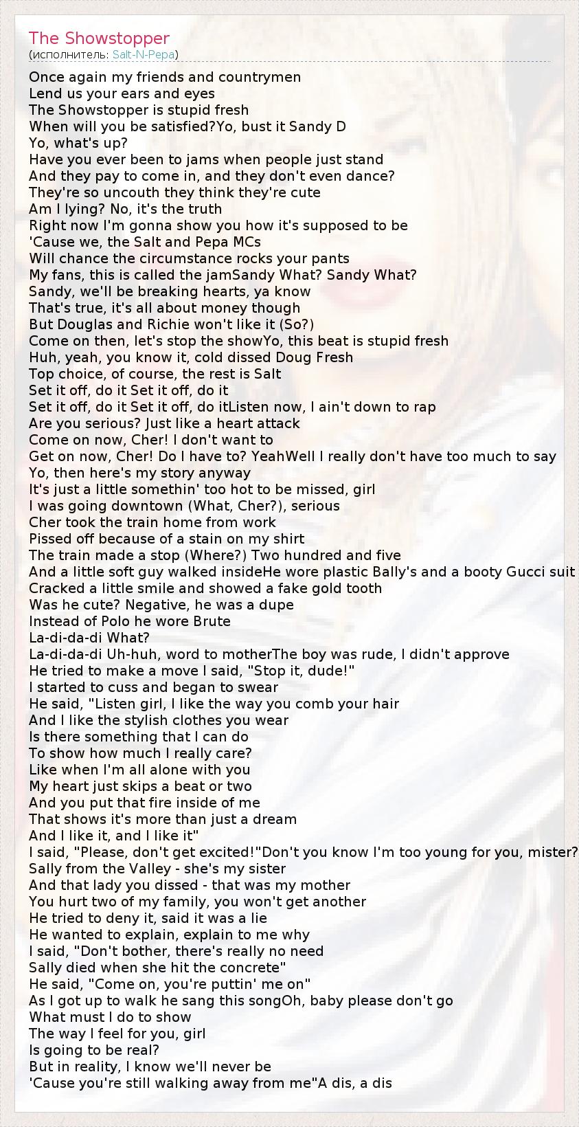 А как ты думаешь, о чем песня "The Showstopper" ?