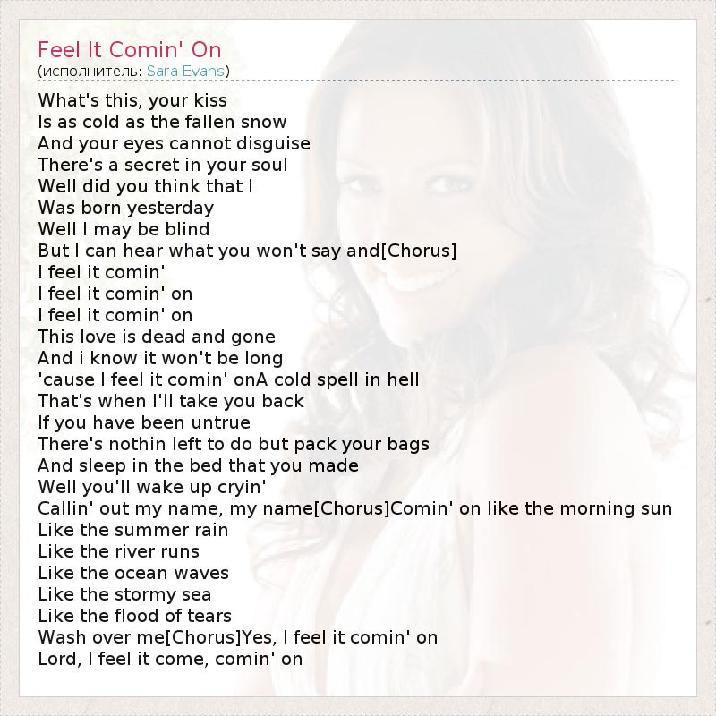 What's this, your kiss Is as cold as the fallen snow And your eyes cannot disguise There's a secret in your soul Well did you think that I Was born yesterday Well I may be blind But I can hear what you won't say and[Chorus] I feel it comin' I feel it comin' on I feel it comin' on This love is dead and gone And i know it won't be long 'cause I feel it comin' onA cold spell in hell That's when I'll take you back If you have been untrue There's nothin left to do but pack your bags And sleep in the bed that you made Well you'll wake up cryin' Callin' out my name, my name[Chorus]Comin' on like the morning sun Like the summer rain Like the river runs Like the ocean waves Like the stormy sea Like the flood of tears Wash over me[Chorus]Yes, I feel it comin' on Lord, I feel it come, comin' on