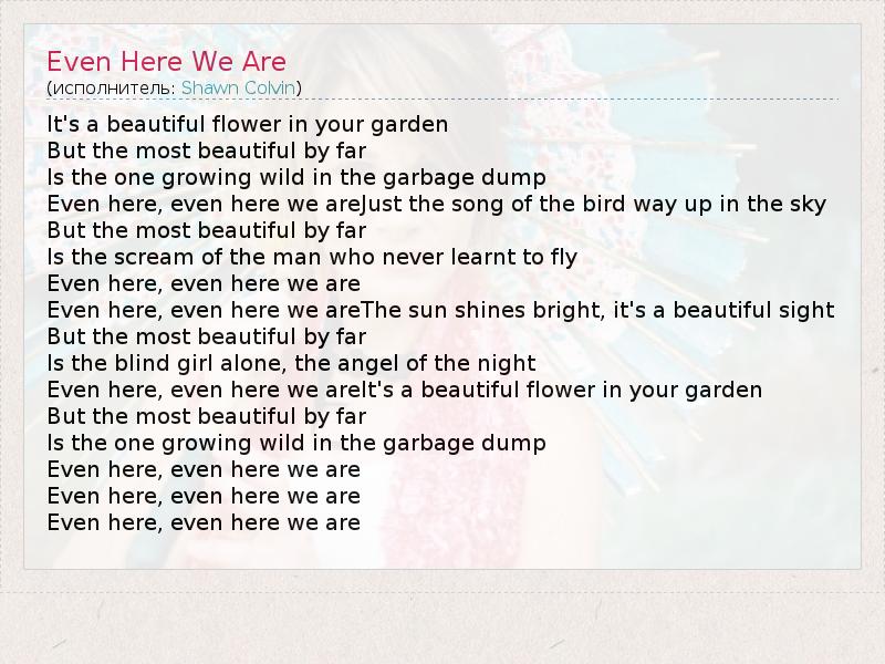 It's a beautiful flower in your garden But the most beautiful by far Is the one growing wild in the garbage dump Even here, even here we areJust the song of the bird way up in the sky But the most beautiful by far Is the scream of the man who never learnt to fly Even here, even here we are Even here, even here we areThe sun shines bright, it's a beautiful sight But the most beautiful by far Is the blind girl alone, the angel of the night Even here, even here we areIt's a beautiful flower in your garden But the most beautiful by far Is the one growing wild in the garbage dump Even here, even here we are Even here, even here we are Even here, even here we are