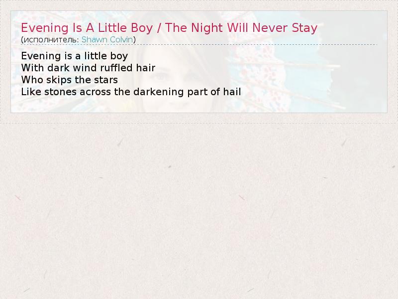 А как ты думаешь, о чем песня "Evening Is A Little Boy / The Night Will Never Stay" ?
