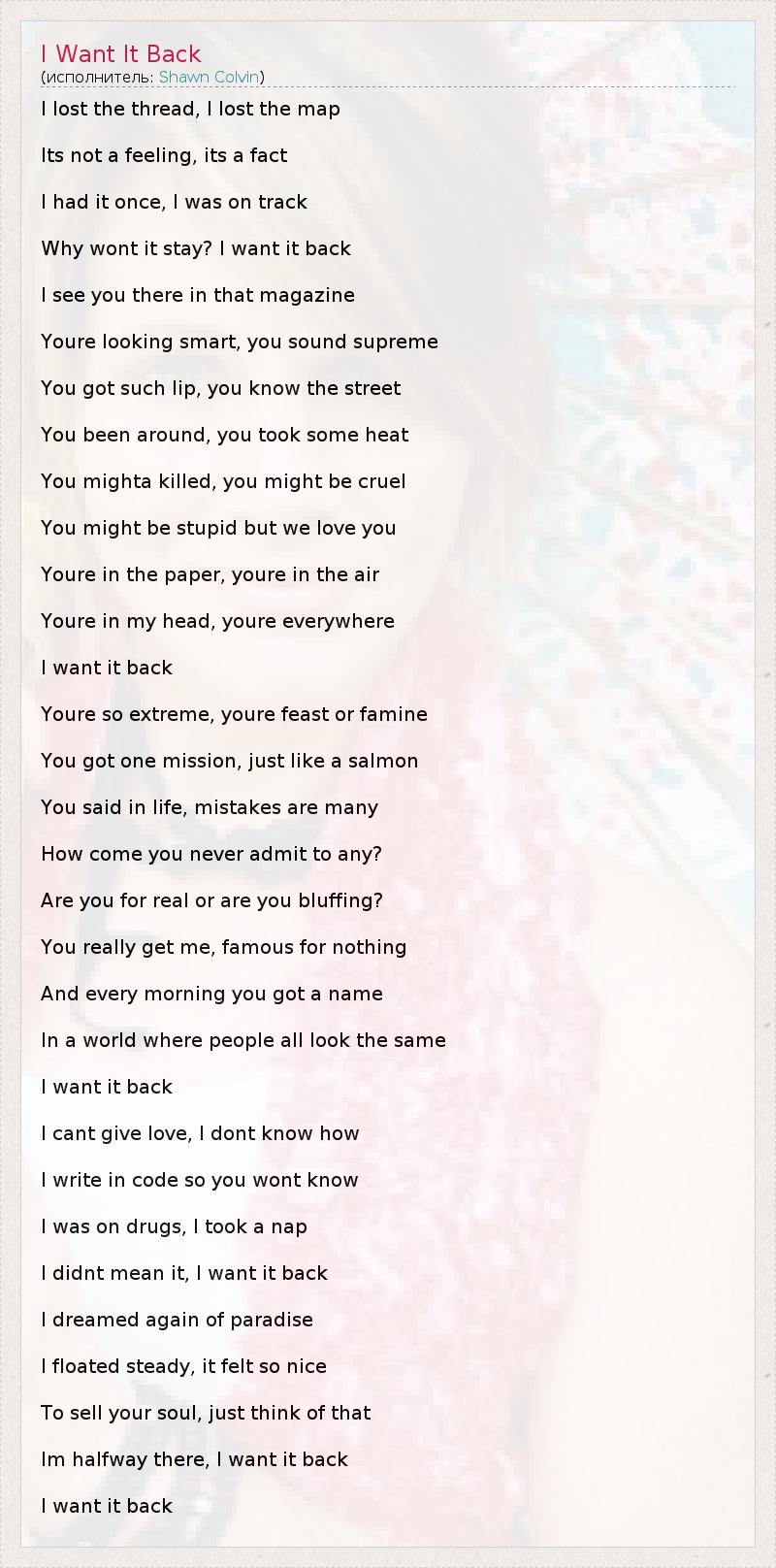 I lost the thread, I lost the map Its not a feeling, its a fact I had it once, I was on track Why wont it stay? I want it back I see you there in that magazine Youre looking smart, you sound supreme You got such lip, you know the street You been around, you took some heat You mighta killed, you might be cruel You might be stupid but we love you Youre in the paper, youre in the air Youre in my head, youre everywhere I want it back Youre so extreme, youre feast or famine You got one mission, just like a salmon You said in life, mistakes are many How come you never admit to any? Are you for real or are you bluffing? You really get me, famous for nothing And every morning you got a name In a world where people all look the same I want it back I cant give love, I dont know how I write in code so you wont know I was on drugs, I took a nap I didnt mean it, I want it back I dreamed again of paradise I floated steady, it felt so nice To sell your soul, just think of that Im halfway there, I want it back I want it back