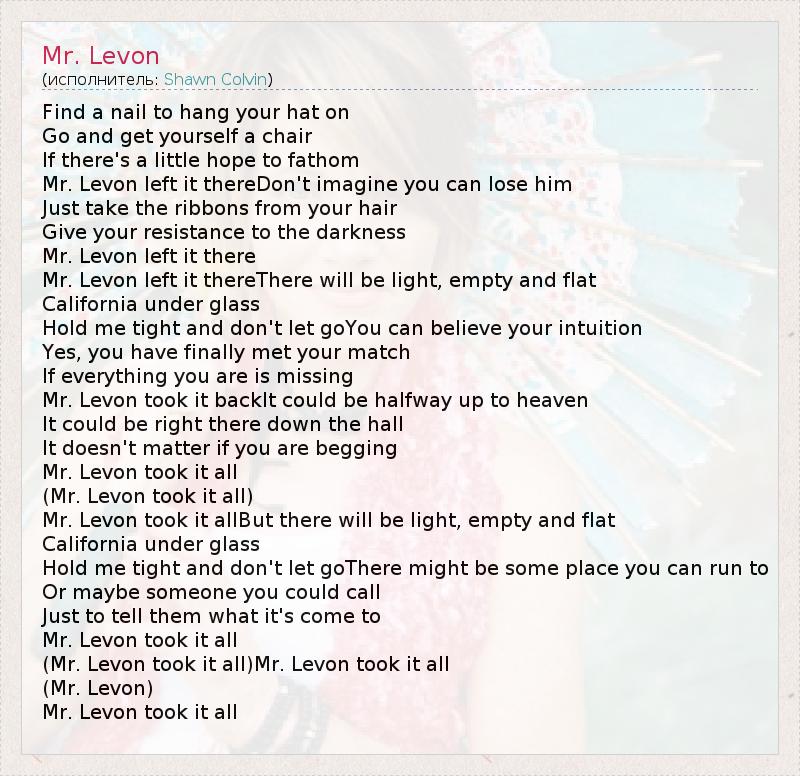 Find a nail to hang your hat on Go and get yourself a chair If there's a little hope to fathom Mr. Levon left it thereDon't imagine you can lose him Just take the ribbons from your hair Give your resistance to the darkness Mr. Levon left it there Mr. Levon left it thereThere will be light, empty and flat California under glass Hold me tight and don't let goYou can believe your intuition Yes, you have finally met your match If everything you are is missing Mr. Levon took it backIt could be halfway up to heaven It could be right there down the hall It doesn't matter if you are begging Mr. Levon took it all (Mr. Levon took it all) Mr. Levon took it allBut there will be light, empty and flat California under glass Hold me tight and don't let goThere might be some place you can run to Or maybe someone you could call Just to tell them what it's come to Mr. Levon took it all (Mr. Levon took it all)Mr. Levon took it all (Mr. Levon) Mr. Levon took it all