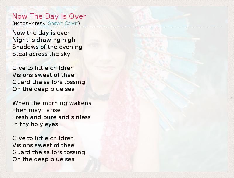 Now the day is over Night is drawing nigh Shadows of the evening Steal across the sky Give to little children Visions sweet of thee Guard the sailors tossing On the deep blue sea When the morning wakens Then may i arise Fresh and pure and sinless In thy holy eyes Give to little children Visions sweet of thee Guard the sailors tossing On the deep blue sea