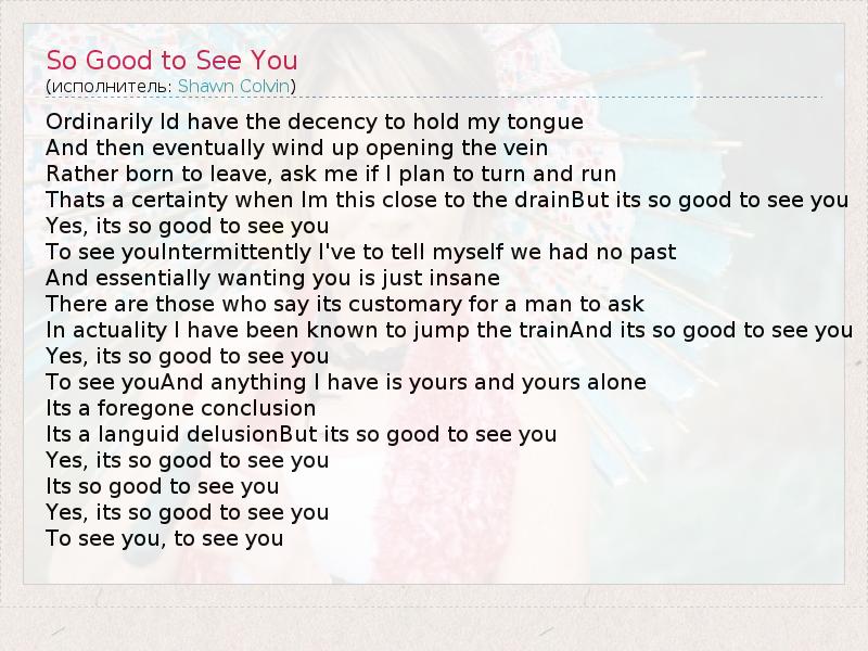 Ordinarily Id have the decency to hold my tongue And then eventually wind up opening the vein Rather born to leave, ask me if I plan to turn and run Thats a certainty when Im this close to the drainBut its so good to see you Yes, its so good to see you To see youIntermittently I've to tell myself we had no past And essentially wanting you is just insane There are those who say its customary for a man to ask In actuality I have been known to jump the trainAnd its so good to see you Yes, its so good to see you To see youAnd anything I have is yours and yours alone Its a foregone conclusion Its a languid delusionBut its so good to see you Yes, its so good to see you Its so good to see you Yes, its so good to see you To see you, to see you