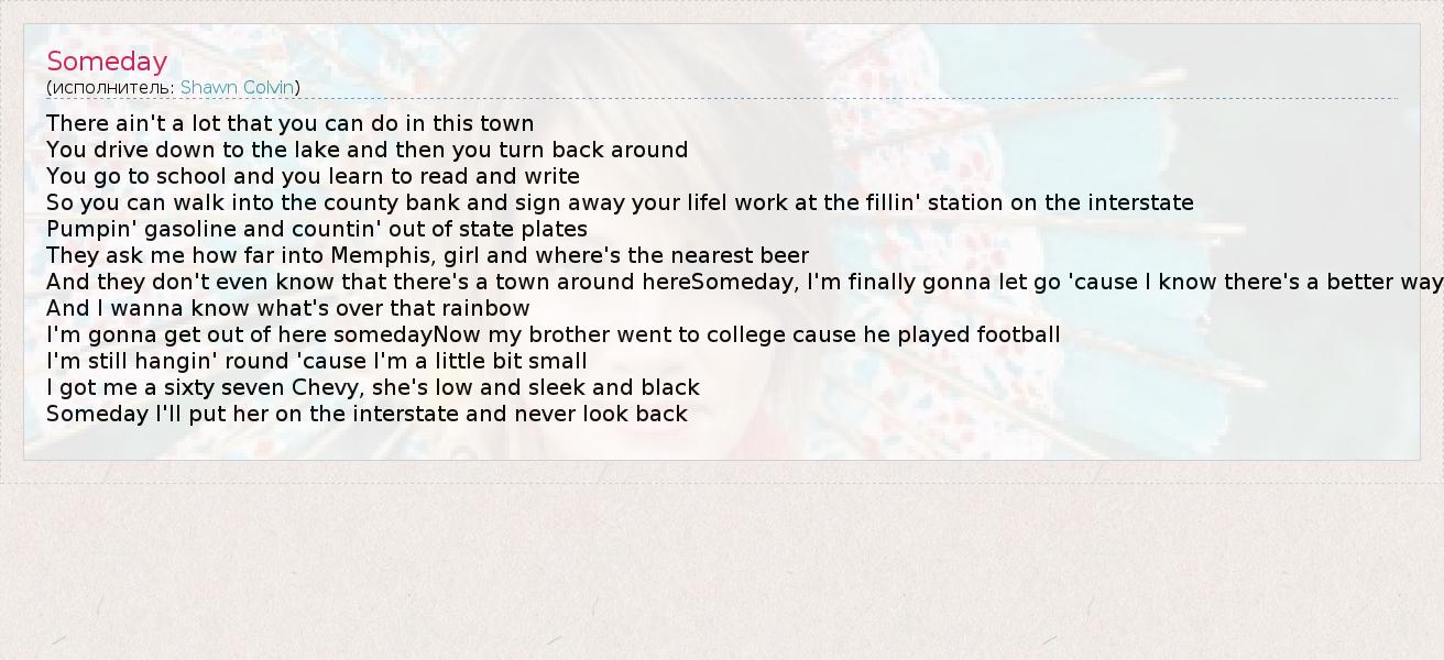 Это интересно:Шон Колвин (Shawn Colvin, род. 10 января, 1956, Вермиллион, Южная Дакота, США) - современная американская певица, автор-исполнитель в жанре фолк-музыки. Трижды лауреат премии Грэмми (1991, дважды в 1998).БиографияВыросла в городкe Карбондейл в Иллинойсе, училась в местном университете, с 15 лет на любительской сцене, подражала Джони Митчелл. С конца 1970-х выступала на профессиональной сцене (продюсер... продолжение