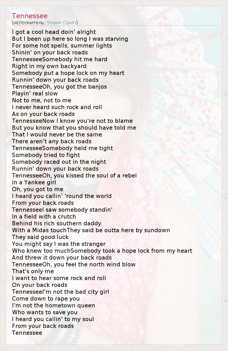 I got a cool head doin' alright But I been up here so long I was starving For some hot spells, summer lights Shinin' on your back roads TennesseeSomebody hit me hard Right in my own backyard Somebody put a hope lock on my heart Runnin' down your back roads TennesseeOh, you got the banjos Playin' real slow Not to me, not to me I never heard such rock and roll As on your back roads TennesseeNow I know you're not to blame But you know that you should have told me That I would never be the same There aren't any back roads TennesseeSomebody held me tight Somebody tried to fight Somebody raced out in the night Runnin' down your back roads TennesseeOh, you kissed the soul of a rebel In a Yankee girl Oh, you got to me I heard you callin' 'round the world From your back roads TennesseeI saw somebody standin' In a field with a crutch Behind his rich southern daddy With a Midas touchThey said be outta here by sundown They said good luck You might say I was the stranger Who knew too muchSomebody took a hope lock from my heart And threw it down your back roads TennesseeOh, you feel the north wind blow That's only me I want to hear some rock and roll On your back roads TennesseeI'm not the bad city girl Come down to rape you I'm not the hometown queen Who wants to save you I heard you callin' to my soul From your back roads Tennessee