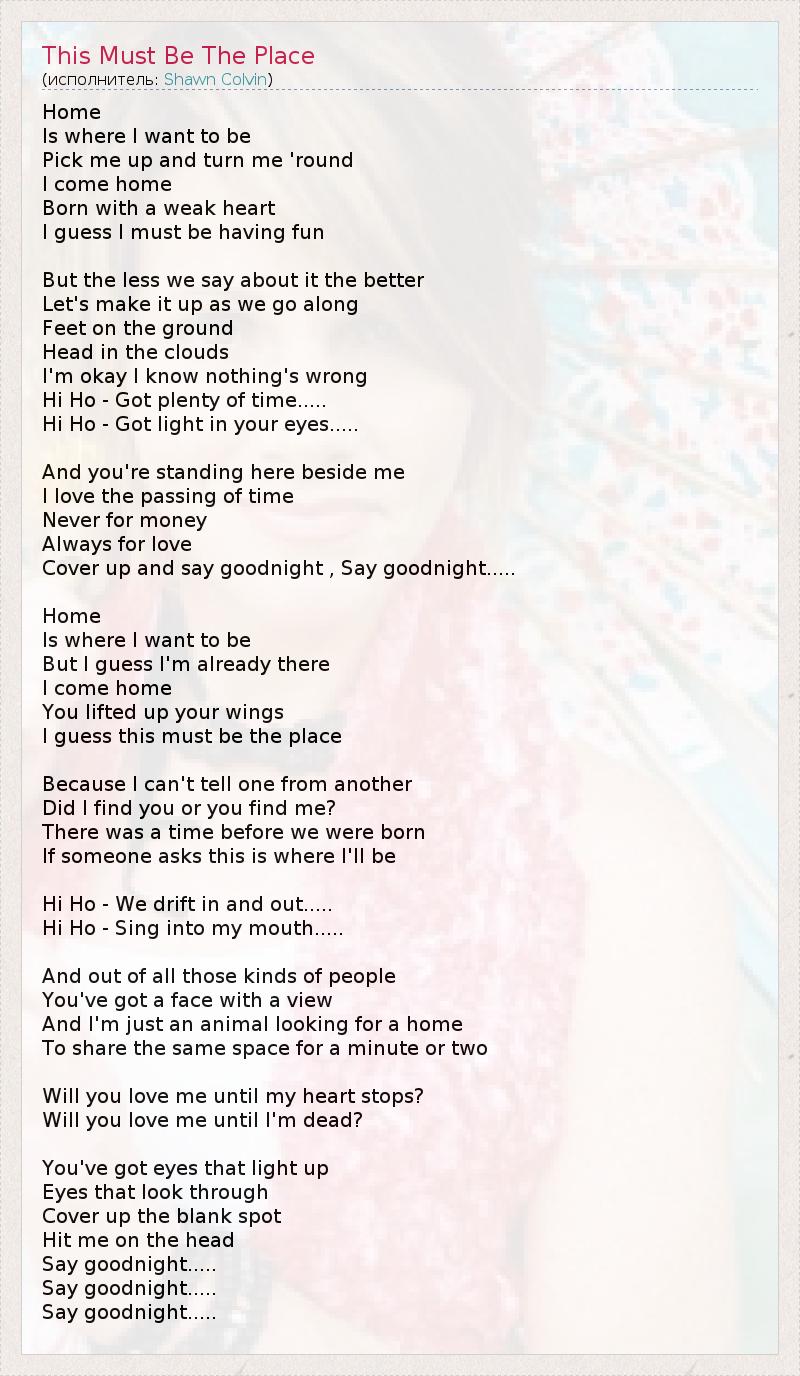 Home Is where I want to be Pick me up and turn me 'round I come home Born with a weak heart I guess I must be having fun But the less we say about it the better Let's make it up as we go along Feet on the ground Head in the clouds I'm okay I know nothing's wrong Hi Ho - Got plenty of time..... Hi Ho - Got light in your eyes..... And you're standing here beside me I love the passing of time Never for money Always for love Cover up and say goodnight , Say goodnight..... Home Is where I want to be But I guess I'm already there I come home You lifted up your wings I guess this must be the place Because I can't tell one from another Did I find you or you find me? There was a time before we were born If someone asks this is where I'll be Hi Ho - We drift in and out..... Hi Ho - Sing into my mouth..... And out of all those kinds of people You've got a face with a view And I'm just an animal looking for a home To share the same space for a minute or two Will you love me until my heart stops? Will you love me until I'm dead? You've got eyes that light up Eyes that look through Cover up the blank spot Hit me on the head Say goodnight..... Say goodnight..... Say goodnight.....