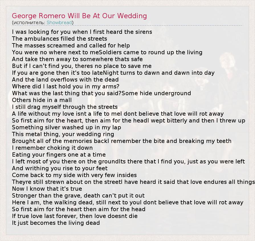 ГлавнаяИсполнителиShowbreadGeorge Romero Will Be At Our Wedding