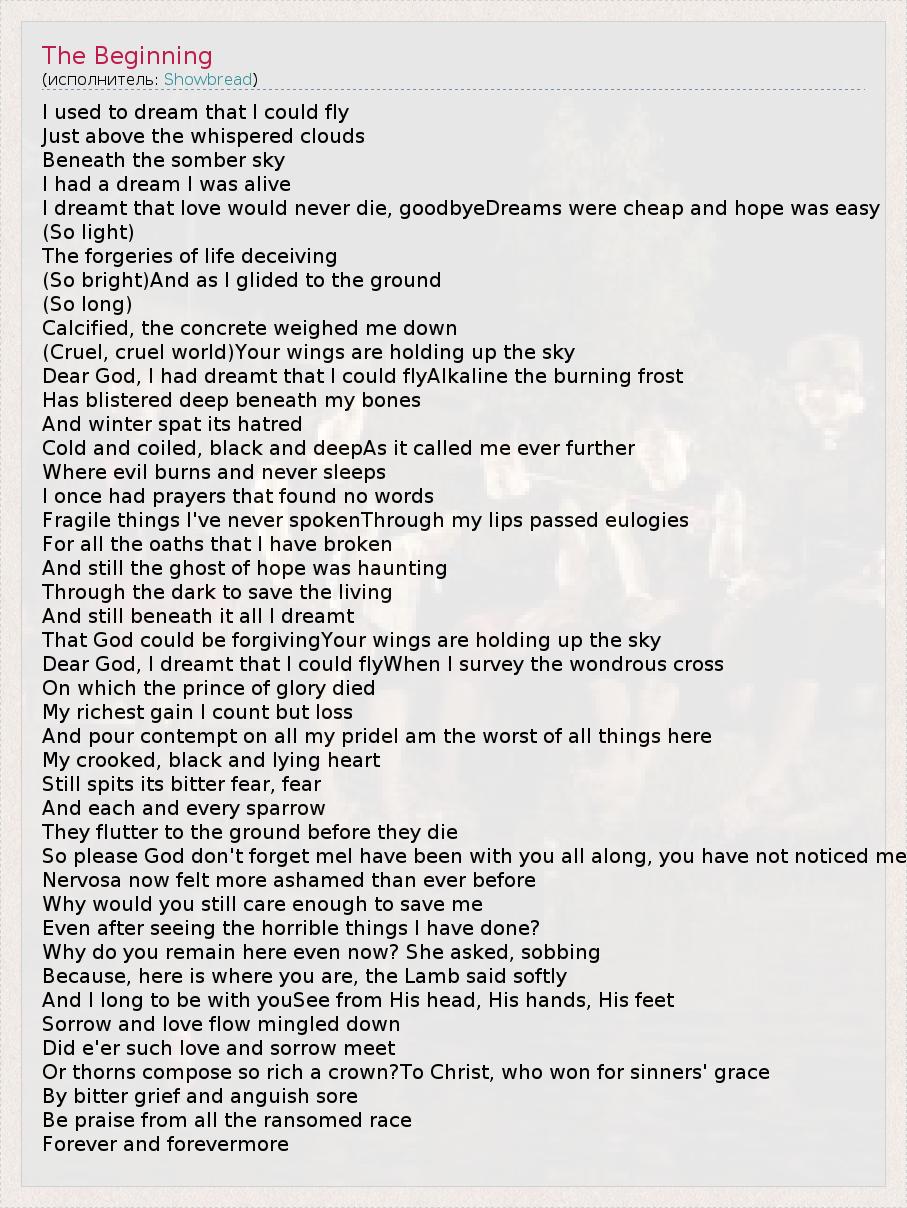 I used to dream that I could fly Just above the whispered clouds Beneath the somber sky I had a dream I was alive I dreamt that love would never die, goodbyeDreams were cheap and hope was easy (So light) The forgeries of life deceiving (So bright)And as I glided to the ground (So long) Calcified, the concrete weighed me down (Cruel, cruel world)Your wings are holding up the sky Dear God, I had dreamt that I could flyAlkaline the burning frost Has blistered deep beneath my bones And winter spat its hatred Cold and coiled, black and deepAs it called me ever further Where evil burns and never sleeps I once had prayers that found no words Fragile things I've never spokenThrough my lips passed eulogies For all the oaths that I have broken And still the ghost of hope was haunting Through the dark to save the living And still beneath it all I dreamt That God could be forgivingYour wings are holding up the sky Dear God, I dreamt that I could flyWhen I survey the wondrous cross On which the prince of glory died My richest gain I count but loss And pour contempt on all my prideI am the worst of all things here My crooked, black and lying heart Still spits its bitter fear, fear And each and every sparrow They flutter to the ground before they die So please God don't forget meI have been with you all along, you have not noticed me Nervosa now felt more ashamed than ever before Why would you still care enough to save me Even after seeing the horrible things I have done? Why do you remain here even now? She asked, sobbing Because, here is where you are, the Lamb said softly And I long to be with youSee from His head, His hands, His feet Sorrow and love flow mingled down Did e'er such love and sorrow meet Or thorns compose so rich a crown?To Christ, who won for sinners' grace By bitter grief and anguish sore Be praise from all the ransomed race Forever and forevermore