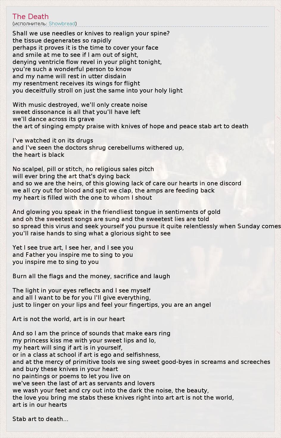 Должны ли мы использовать иглы или ножи, чтобы перестроить ваш позвоночник? ткани вырождается так быстро возможно, это доказывает, что время, чтобы покрыть лицо и улыбка у меня, чтобы увидеть, если я нахожусь вне поля зрения, отрицая пир потока желудочка в нелегкой судьбе сегодня, ты такой замечательный человек, чтобы узнать, и мое имя будет отдыхать в полном презрении мой обиды получает свои крылья для полета Вы обманом прогуляться по точно такой же в вашем святом свете С музыка уничтожены, мы только создают шум сладкий диссонанс это все, что вы оставили мы будем танцевать по его могиле Искусство пения пустой похвалы ножами надежды и мира колотой искусства в смерти Я наблюдал это на своих препаратов и я видел, как врачи пожимают Мозжечки увядшие вверх, сердце черный Нет скальпель, таблетки или строчки, ни одна религиозная продаж шаг когда-либо принести искусство, умирает назад и таким образом, мы являемся наследниками, этого светящегося отсутствия ухода наши сердца в одном раздора все мы кричать крови и плевать мы хлопаем, усилители питаются назад мое сердце наполняется, кому я кричу И светящиеся вы говорите в дружелюбных языка в настроениях золота и о сладкие песни поются и сладкие ложь сказал так распространился этот вирус и искать себя, вы преследовать его неустанно достаточно, когда приходит воскресенье Вы поднять руки, чтобы петь то, что славное зрелище Тем не менее, я вижу истинное искусство, я вижу ее, и я вижу тебя и Отец вы вдохновляют меня петь для вас Вы вдохновляют меня петь для вас Записывайте все флаги и деньги, жертву и смеяться Свет в твоих глазах отражается и я вижу себя и все, что я хочу быть для тебя я дам все, просто задержаться на ваших губах и чувствовать кончики пальцев, вы ангел Искусство не мир, искусство в нашем сердце И поэтому я принца звуков, которые делают уши кольцо моя принцесса поцеловать меня своими сладкими губами и вот, мое сердце будет петь, если искусство в себе, или в классе в школе, если искусство эго и эгоизм, и на милость примитивных инструментов, которые мы поем сладкие прощания в криков и криками и похоронить эти ножи в сердце никаких картин или стихов не позволяют жить на мы видели в прошлом искусства в качестве слуг и любителей мы мыть ноги и кричать в темном шума, красота, любовь ты меня пронзает эти ножи прямо в арт-искусства не мир, искусство в наших сердцах Stab искусство смерти ...