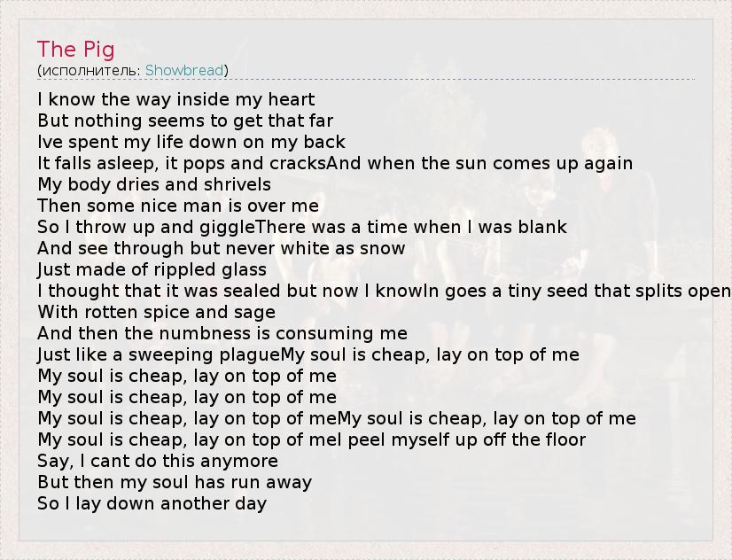 I know the way inside my heart But nothing seems to get that far Ive spent my life down on my back It falls asleep, it pops and cracksAnd when the sun comes up again My body dries and shrivels Then some nice man is over me So I throw up and giggleThere was a time when I was blank And see through but never white as snow Just made of rippled glass I thought that it was sealed but now I knowIn goes a tiny seed that splits open With rotten spice and sage And then the numbness is consuming me Just like a sweeping plagueMy soul is cheap, lay on top of me My soul is cheap, lay on top of me My soul is cheap, lay on top of me My soul is cheap, lay on top of meMy soul is cheap, lay on top of me My soul is cheap, lay on top of meI peel myself up off the floor Say, I cant do this anymore But then my soul has run away So I lay down another day