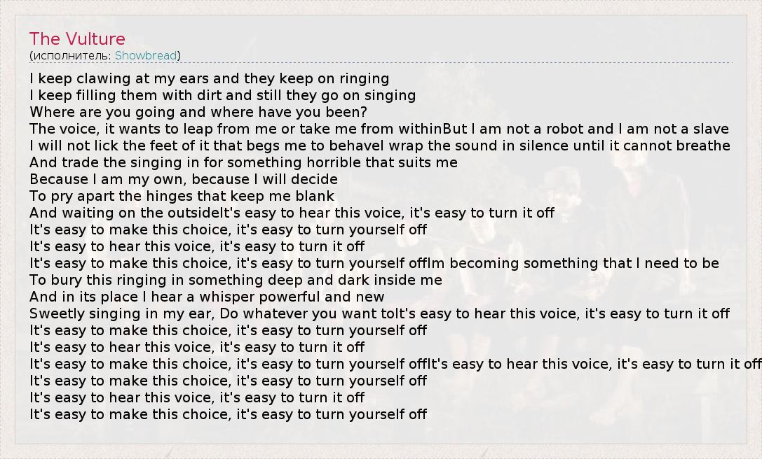 I keep clawing at my ears and they keep on ringing I keep filling them with dirt and still they go on singing Where are you going and where have you been? The voice, it wants to leap from me or take me from withinBut I am not a robot and I am not a slave I will not lick the feet of it that begs me to behaveI wrap the sound in silence until it cannot breathe And trade the singing in for something horrible that suits me Because I am my own, because I will decide To pry apart the hinges that keep me blank And waiting on the outsideIt's easy to hear this voice, it's easy to turn it off It's easy to make this choice, it's easy to turn yourself off It's easy to hear this voice, it's easy to turn it off It's easy to make this choice, it's easy to turn yourself offIm becoming something that I need to be To bury this ringing in something deep and dark inside me And in its place I hear a whisper powerful and new Sweetly singing in my ear, Do whatever you want toIt's easy to hear this voice, it's easy to turn it off It's easy to make this choice, it's easy to turn yourself off It's easy to hear this voice, it's easy to turn it off It's easy to make this choice, it's easy to turn yourself offIt's easy to hear this voice, it's easy to turn it off It's easy to make this choice, it's easy to turn yourself off It's easy to hear this voice, it's easy to turn it off It's easy to make this choice, it's easy to turn yourself off