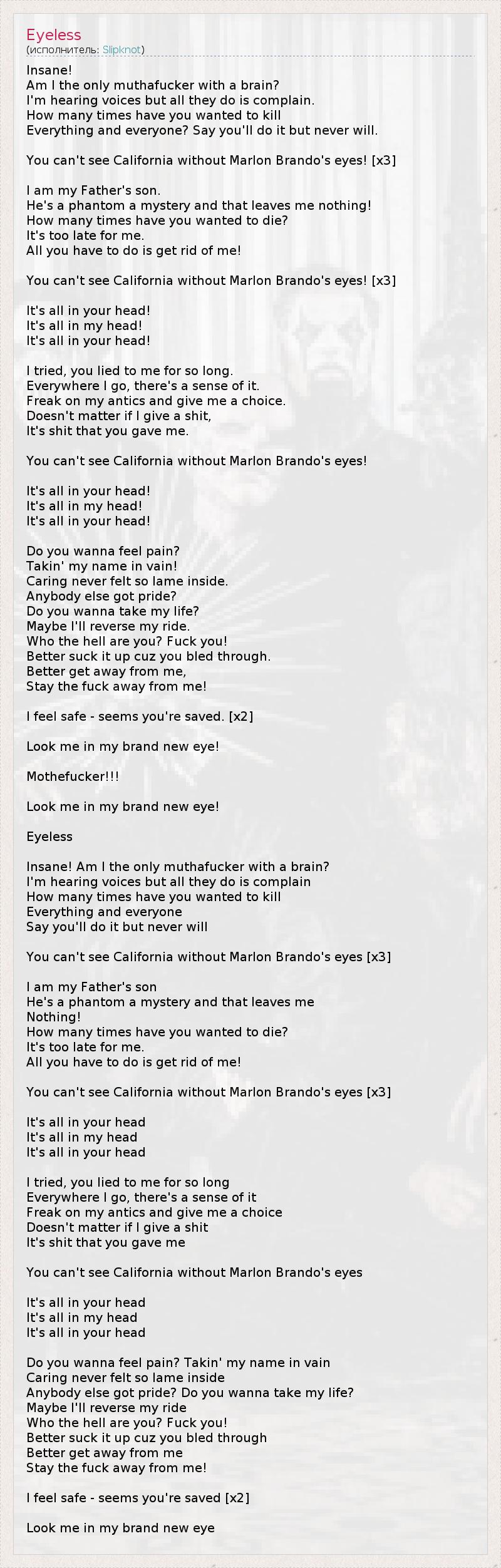 Insane! Am I the only muthafucker with a brain? I'm hearing voices but all they do is complain. How many times have you wanted to kill Everything and everyone? Say you'll do it but never will. You can't see California without Marlon Brando's eyes! [х3] I am my Father's son. He's a phantom a mystery and that leaves me nothing! How many times have you wanted to die? It's too late for me. All you have to do is get rid of me! You can't see California without Marlon Brando's eyes! [х3] It's all in your head! It's all in my head! It's all in your head! I tried, you lied to me for so long. Everywhere I go, there's a sense of it. Freak on my antics and give me a choice. Doesn't matter if I give a shit, It's shit that you gave me. You can't see California without Marlon Brando's eyes! It's all in your head! It's all in my head! It's all in your head! Do you wanna feel pain? Takin' my name in vain! Caring never felt so lame inside. Anybody else got pride? Do you wanna take my life? Maybe I'll reverse my ride. Who the hell are you? Fuck you! Better suck it up cuz you bled through. Better get away from me, Stay the fuck away from me! I feel safe - seems you're saved. [х2] Look me in my brand new eye! Mothefucker!!! Look me in my brand new eye! Eyeless Insane! Am I the only muthafucker with a brain? I'm hearing voices but all they do is complain How many times have you wanted to kill Everything and everyone Say you'll do it but never will You can't see California without Marlon Brando's eyes [х3] I am my Father's son He's a phantom a mystery and that leaves me Nothing! How many times have you wanted to die? It's too late for me. All you have to do is get rid of me! You can't see California without Marlon Brando's eyes [х3] It's all in your head It's all in my head It's all in your head I tried, you lied to me for so long Everywhere I go, there's a sense of it Freak on my antics and give me a choice Doesn't matter if I give a shit It's shit that you gave me You can't see California without Marlon Brando's eyes It's all in your head It's all in my head It's all in your head Do you wanna feel pain? Takin' my name in vain Caring never felt so lame inside Anybody else got pride? Do you wanna take my life? Maybe I'll reverse my ride Who the hell are you? Fuck you! Better suck it up cuz you bled through Better get away from me Stay the fuck away from me! I feel safe - seems you're saved [х2] Look me in my brand new eye