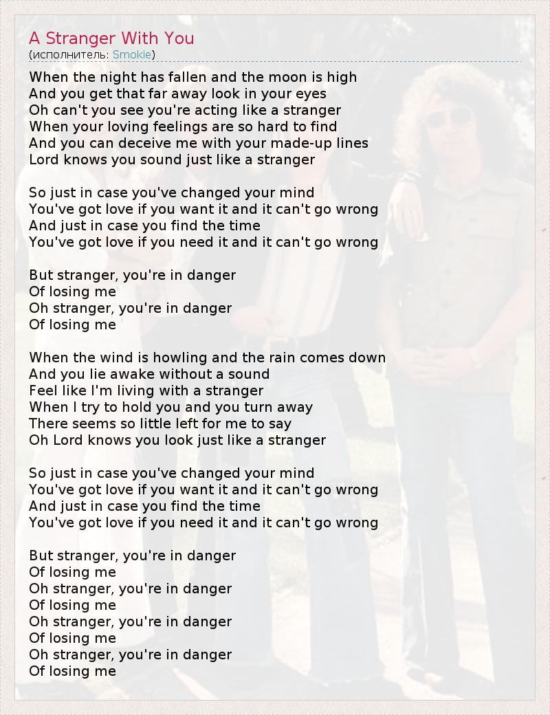 When the night has fallen and the moon is high And you get that far away look in your eyes Oh can't you see you're acting like a stranger When your loving feelings are so hard to find And you can deceive me with your made-up lines Lord knows you sound just like a stranger So just in case you've changed your mind You've got love if you want it and it can't go wrong And just in case you find the time You've got love if you need it and it can't go wrong But stranger, you're in danger Of losing me Oh stranger, you're in danger Of losing me When the wind is howling and the rain comes down And you lie awake without a sound Feel like I'm living with a stranger When I try to hold you and you turn away There seems so little left for me to say Oh Lord knows you look just like a stranger So just in case you've changed your mind You've got love if you want it and it can't go wrong And just in case you find the time You've got love if you need it and it can't go wrong But stranger, you're in danger Of losing me Oh stranger, you're in danger Of losing me Oh stranger, you're in danger Of losing me Oh stranger, you're in danger Of losing me