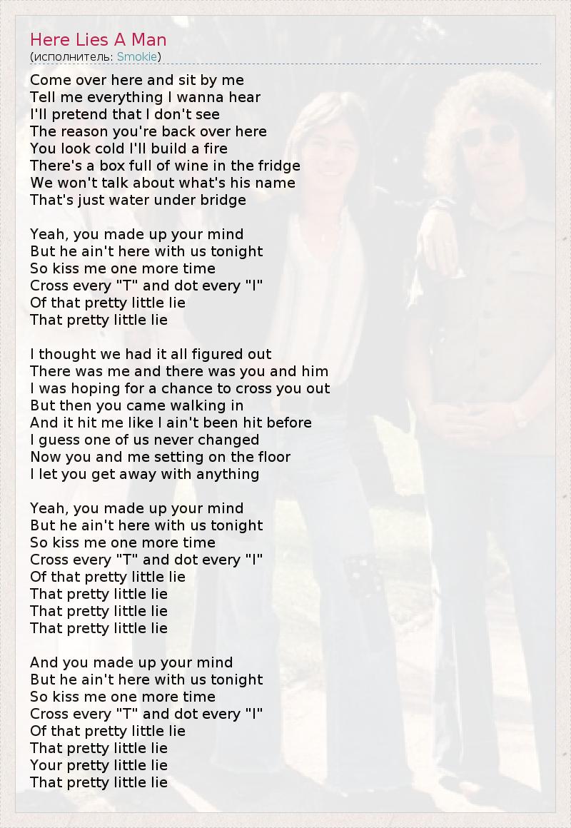 Come over here and sit by me Tell me everything I wanna hear I'll pretend that I don't see The reason you're back over here You look cold I'll build a fire There's a box full of wine in the fridge We won't talk about what's his name That's just water under bridge Yeah, you made up your mind But he ain't here with us tonight So kiss me one more time Cross every "T" and dot every "I" Of that pretty little lie That pretty little lie I thought we had it all figured out There was me and there was you and him I was hoping for a chance to cross you out But then you came walking in And it hit me like I ain't been hit before I guess one of us never changed Now you and me setting on the floor I let you get away with anything Yeah, you made up your mind But he ain't here with us tonight So kiss me one more time Cross every "T" and dot every "I" Of that pretty little lie That pretty little lie That pretty little lie That pretty little lie And you made up your mind But he ain't here with us tonight So kiss me one more time Cross every "T" and dot every "I" Of that pretty little lie That pretty little lie Your pretty little lie That pretty little lie