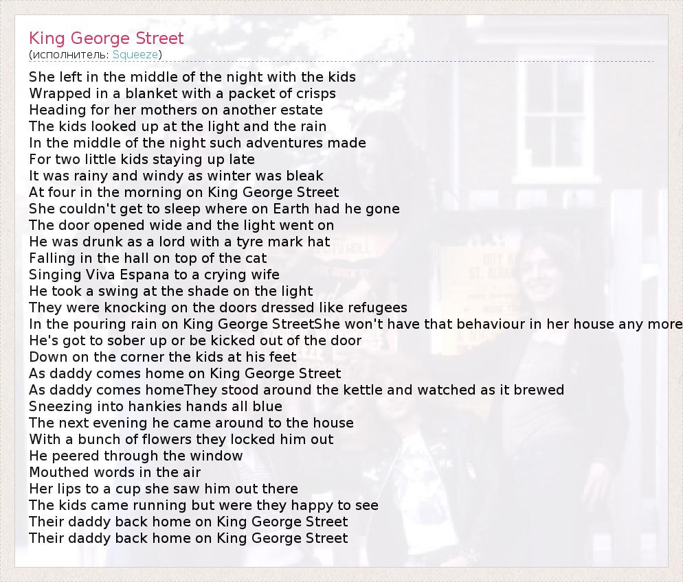 She left in the middle of the night with the kids Wrapped in a blanket with a packet of crisps Heading for her mothers on another estate The kids looked up at the light and the rain In the middle of the night such adventures made For two little kids staying up late It was rainy and windy as winter was bleak At four in the morning on King George Street She couldn't get to sleep where on Earth had he gone The door opened wide and the light went on He was drunk as a lord with a tyre mark hat Falling in the hall on top of the cat Singing Viva Espana to a crying wife He took a swing at the shade on the light They were knocking on the doors dressed like refugees In the pouring rain on King George StreetShe won't have that behaviour in her house any more He's got to sober up or be kicked out of the door Down on the corner the kids at his feet As daddy comes home on King George Street As daddy comes homeThey stood around the kettle and watched as it brewed Sneezing into hankies hands all blue The next evening he came around to the house With a bunch of flowers they locked him out He peered through the window Mouthed words in the air Her lips to a cup she saw him out there The kids came running but were they happy to see Their daddy back home on King George Street Their daddy back home on King George Street