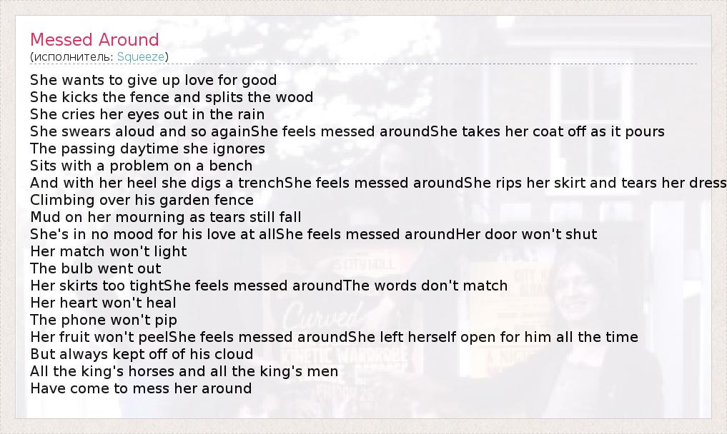 Это интересно:Squeeze — английская группа новой волны, в творчестве которой мотивы панк-, паб-, глэм- и арт-рока соеднились с классической поп-традицией 60-х годов. Крис Диффорд и Гленн Тилбрук (первый из них писал тексты, второй — музыку) никогда не скрывали того, что своими кумирами считают Леннона и Маккартни.История группы началась, когда Крис Диффорд (родился 11 апреля 1954 года) поместил на витрине... продолжение