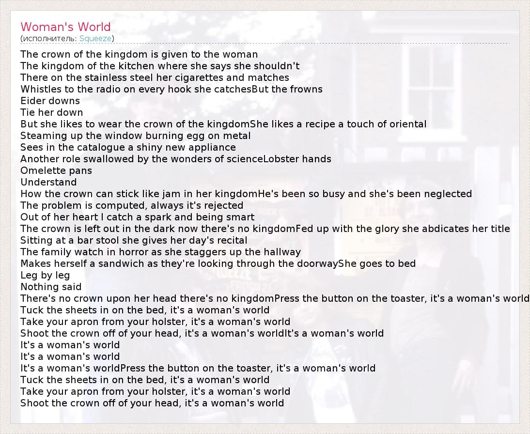 The crown of the kingdom is given to the woman The kingdom of the kitchen where she says she shouldn't There on the stainless steel her cigarettes and matches Whistles to the radio on every hook she catchesBut the frowns Eider downs Tie her down But she likes to wear the crown of the kingdomShe likes a recipe a touch of oriental Steaming up the window burning egg on metal Sees in the catalogue a shiny new appliance Another role swallowed by the wonders of scienceLobster hands Omelette pans Understand How the crown can stick like jam in her kingdomHe's been so busy and she's been neglected The problem is computed, always it's rejected Out of her heart I catch a spark and being smart The crown is left out in the dark now there's no kingdomFed up with the glory she abdicates her title Sitting at a bar stool she gives her day's recital The family watch in horror as she staggers up the hallway Makes herself a sandwich as they're looking through the doorwayShe goes to bed Leg by leg Nothing said There's no crown upon her head there's no kingdomPress the button on the toaster, it's a woman's world Tuck the sheets in on the bed, it's a woman's world Take your apron from your holster, it's a woman's world Shoot the crown off of your head, it's a woman's worldIt's a woman's world It's a woman's world It's a woman's world It's a woman's worldPress the button on the toaster, it's a woman's world Tuck the sheets in on the bed, it's a woman's world Take your apron from your holster, it's a woman's world Shoot the crown off of your head, it's a woman's world