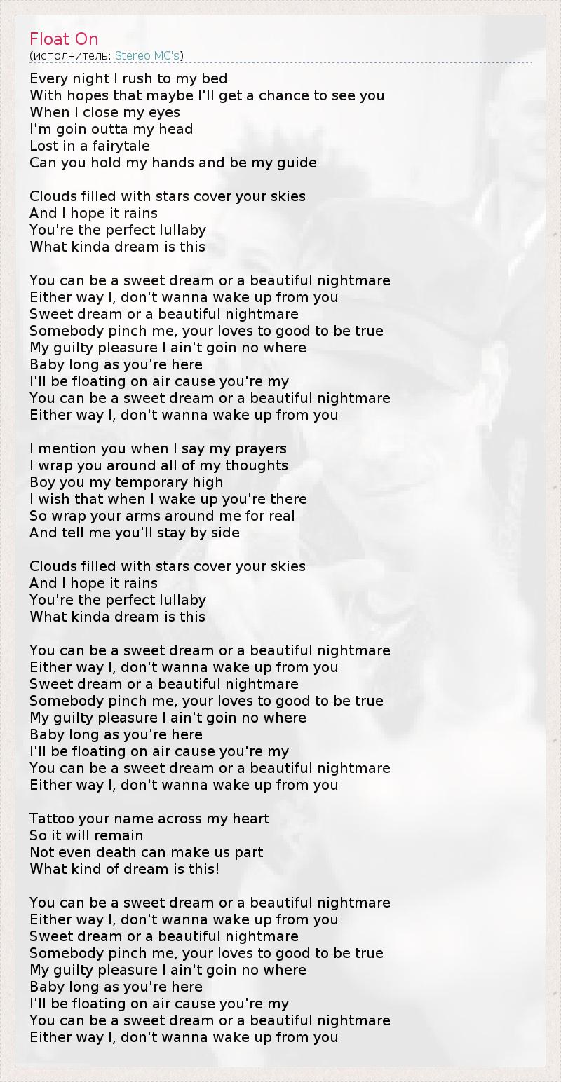 Каждую ночь я спешу лечь в кровать, В надежде, что, возможно, у меня будет шанс увидеть тебя, Когда я закрою глаза. Я теряю рассудок, Оказываюсь в сказке. Можешь взять меня за руку и быть моим проводником? Облака заслоняют звёзды на твоём небе, И я надеюсь, пойдёт дождь. Ты идеальная колыбельная, Что это за сон? Ты можешь быть сладким сном или красивым кошмаром, В любом случае я не хочу просыпаться. Сладкий сон или красивый кошмар, Кто-нибудь, ущипните меня, твоя любовь слишком хороша, чтобы быть правдой. Моё запретное наслаждение, я никуда не уйду, Детка, пока ты здесь Я плыву по воздуху, потому что ты мой. Ты можешь быть сладким сном или красивым кошмаром, В любом случае я не хочу просыпаться. Я упоминаю тебя в своих молитвах, Я укрою тебя в своих мыслях, Мальчик, ты моё временное наслаждение, Я мечтаю, что, когда я проснусь, ты будешь здесь. Так обними меня по-настоящему И скажи, что останешься со мной. Облака заслоняют звёзды на твоём небе, И я надеюсь, пойдёт дождь. Ты идеальная колыбельная, Что это за сон? Ты можешь быть сладким сном или красивым кошмаром, В любом случае я не хочу просыпаться. Сладкий сон или красивый кошмар, Кто-нибудь, ущипните меня, твоя любовь слишком хороша, чтобы быть правдой. Моё запретное наслаждение, я никуда не уйду, Детка, пока ты здесь Я плыву по воздуху, потому что ты мой. Ты можешь быть сладким сном или красивым кошмаром, В любом случае я не хочу просыпаться. Сделаю тату с твоим именем на моём сердце, И это будет напоминать, Что даже смерть не разлучит нас. Что это за сон? Ты можешь быть сладким сном или красивым кошмаром, В любом случае я не хочу просыпаться. Сладкий сон или красивый кошмар, Кто-нибудь, ущипните меня, твоя любовь слишком хороша, чтобы быть правдой. Моё запретное наслаждение, я никуда не уйду, Детка, пока ты здесь Я плыву по воздуху, потому что ты мой. Ты можешь быть сладким сном или красивым кошмаром, В любом случае я не хочу просыпаться.