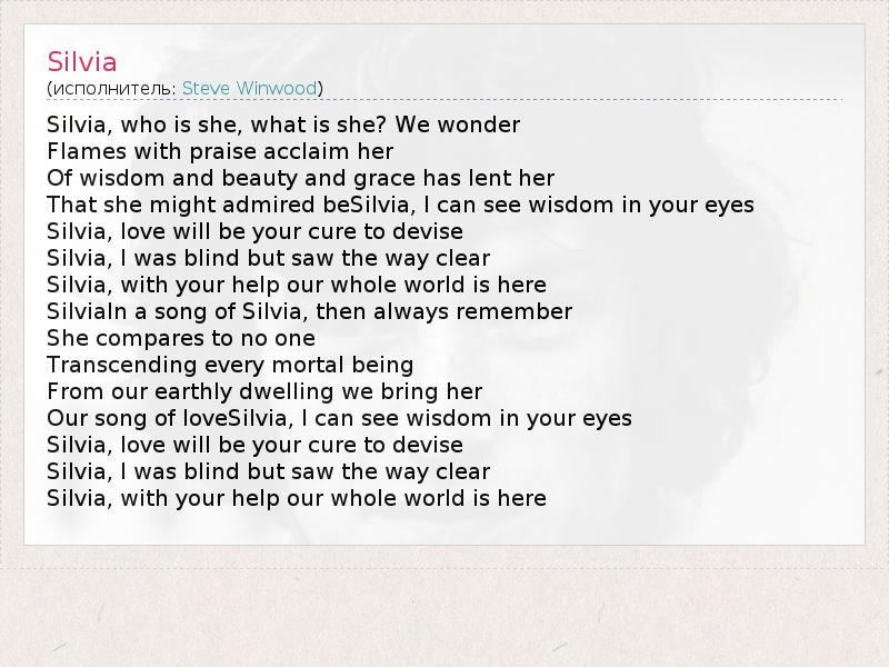 Silvia, who is she, what is she? We wonder Flames with praise acclaim her Of wisdom and beauty and grace has lent her That she might admired beSilvia, I can see wisdom in your eyes Silvia, love will be your cure to devise Silvia, I was blind but saw the way clear Silvia, with your help our whole world is here SilviaIn a song of Silvia, then always remember She compares to no one Transcending every mortal being From our earthly dwelling we bring her Our song of loveSilvia, I can see wisdom in your eyes Silvia, love will be your cure to devise Silvia, I was blind but saw the way clear Silvia, with your help our whole world is here
