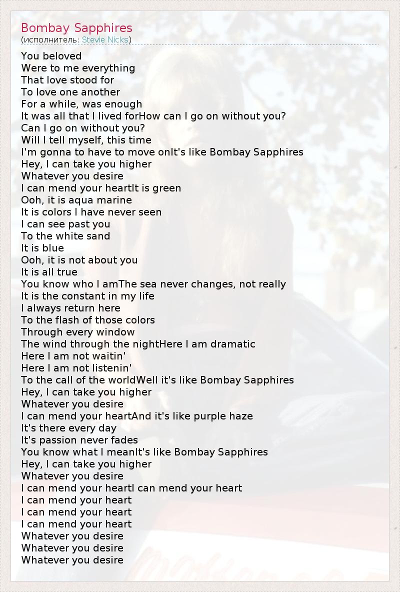 You beloved Were to me everything That love stood for To love one another For a while, was enough It was all that I lived forHow can I go on without you? Can I go on without you? Will I tell myself, this time I'm gonna to have to move onIt's like Bombay Sapphires Hey, I can take you higher Whatever you desire I can mend your heartIt is green Ooh, it is aqua marine It is colors I have never seen I can see past you To the white sand It is blue Ooh, it is not about you It is all true You know who I amThe sea never changes, not really It is the constant in my life I always return here To the flash of those colors Through every window The wind through the nightHere I am dramatic Here I am not waitin' Here I am not listenin' To the call of the worldWell it's like Bombay Sapphires Hey, I can take you higher Whatever you desire I can mend your heartAnd it's like purple haze It's there every day It's passion never fades You know what I meanIt's like Bombay Sapphires Hey, I can take you higher Whatever you desire I can mend your heartI can mend your heart I can mend your heart I can mend your heart I can mend your heart Whatever you desire Whatever you desire Whatever you desire