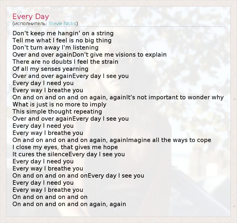 Don't keep me hangin' on a string Tell me what I feel is no big thing Don't turn away I'm listening Over and over againDon't give me visions to explain There are no doubts I feel the strain Of all my senses yearning Over and over againEvery day I see you Every day I need you Every way I breathe you On and on and on and on again, againIt's not important to wonder why What is just is no more to imply This simple thought repeating Over and over againEvery day I see you Every day I need you Every way I breathe you On and on and on and on again, againImagine all the ways to cope I close my eyes, that gives me hope It cures the silenceEvery day I see you Every day I need you Every way I breathe you On and on and on and onEvery day I see you Every day I need you Every way I breathe you On and on and on and on On and on and on and on again, again