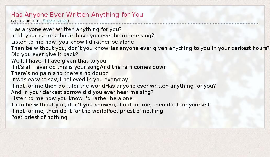 А как ты думаешь, о чем песня "Has Anyone Ever Written Anything for You" ?