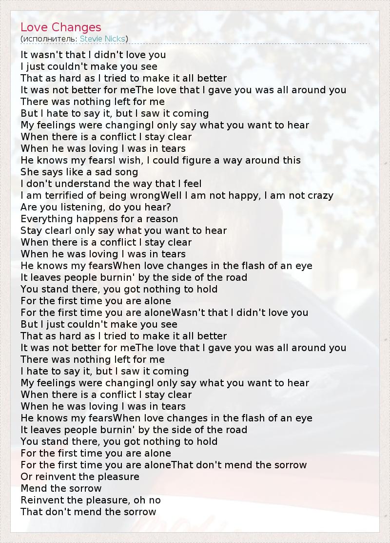 It wasn't that I didn't love you I just couldn't make you see That as hard as I tried to make it all better It was not better for meThe love that I gave you was all around you There was nothing left for me But I hate to say it, but I saw it coming My feelings were changingI only say what you want to hear When there is a conflict I stay clear When he was loving I was in tears He knows my fearsI wish, I could figure a way around this She says like a sad song I don't understand the way that I feel I am terrified of being wrongWell I am not happy, I am not crazy Are you listening, do you hear? Everything happens for a reason Stay clearI only say what you want to hear When there is a conflict I stay clear When he was loving I was in tears He knows my fearsWhen love changes in the flash of an eye It leaves people burnin' by the side of the road You stand there, you got nothing to hold For the first time you are alone For the first time you are aloneWasn't that I didn't love you But I just couldn't make you see That as hard as I tried to make it all better It was not better for meThe love that I gave you was all around you There was nothing left for me I hate to say it, but I saw it coming My feelings were changingI only say what you want to hear When there is a conflict I stay clear When he was loving I was in tears He knows my fearsWhen love changes in the flash of an eye It leaves people burnin' by the side of the road You stand there, you got nothing to hold For the first time you are alone For the first time you are aloneThat don't mend the sorrow Or reinvent the pleasure Mend the sorrow Reinvent the pleasure, oh no That don't mend the sorrow