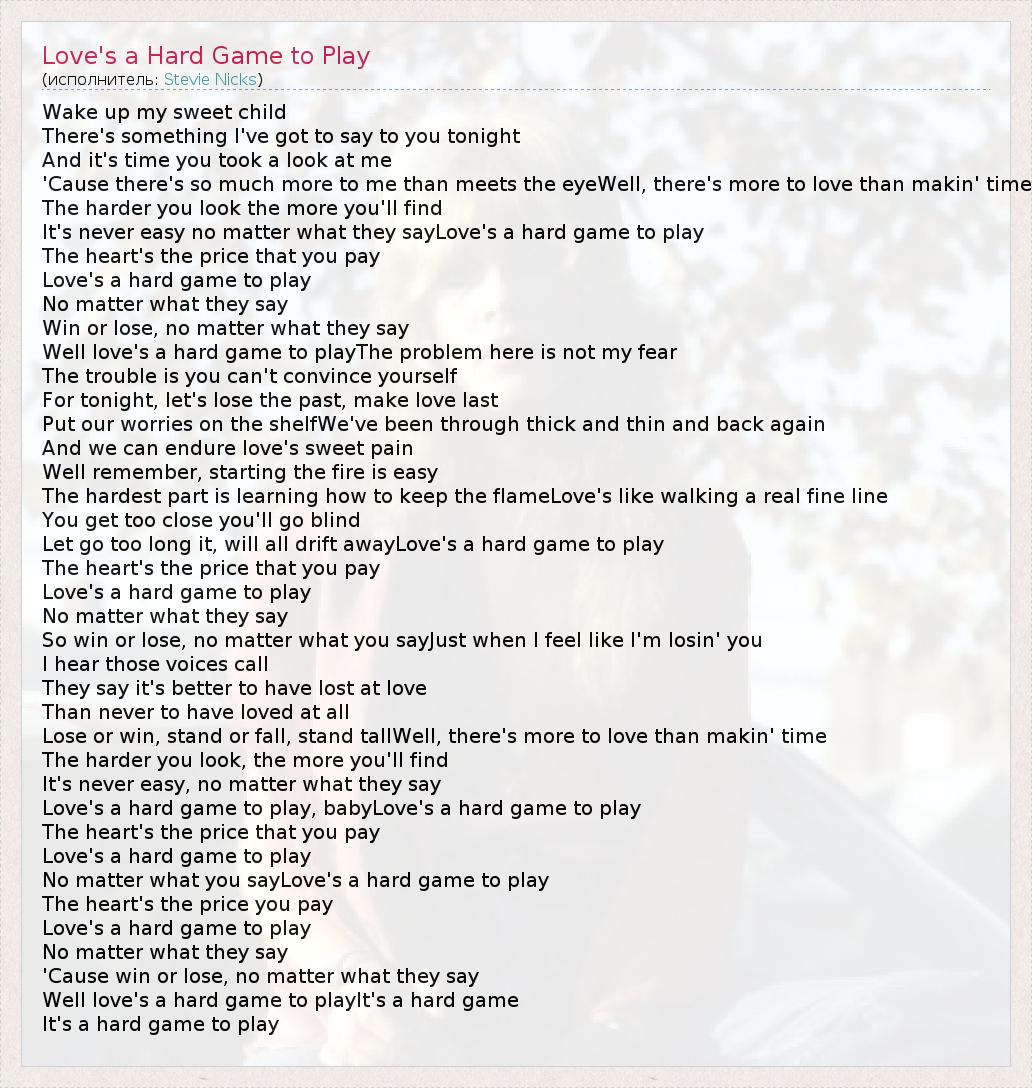 Wake up my sweet child There's something I've got to say to you tonight And it's time you took a look at me 'Cause there's so much more to me than meets the eyeWell, there's more to love than makin' time The harder you look the more you'll find It's never easy no matter what they sayLove's a hard game to play The heart's the price that you pay Love's a hard game to play No matter what they say Win or lose, no matter what they say Well love's a hard game to playThe problem here is not my fear The trouble is you can't convince yourself For tonight, let's lose the past, make love last Put our worries on the shelfWe've been through thick and thin and back again And we can endure love's sweet pain Well remember, starting the fire is easy The hardest part is learning how to keep the flameLove's like walking a real fine line You get too close you'll go blind Let go too long it, will all drift awayLove's a hard game to play The heart's the price that you pay Love's a hard game to play No matter what they say So win or lose, no matter what you sayJust when I feel like I'm losin' you I hear those voices call They say it's better to have lost at love Than never to have loved at all Lose or win, stand or fall, stand tallWell, there's more to love than makin' time The harder you look, the more you'll find It's never easy, no matter what they say Love's a hard game to play, babyLove's a hard game to play The heart's the price that you pay Love's a hard game to play No matter what you sayLove's a hard game to play The heart's the price you pay Love's a hard game to play No matter what they say 'Cause win or lose, no matter what they say Well love's a hard game to playIt's a hard game It's a hard game to play