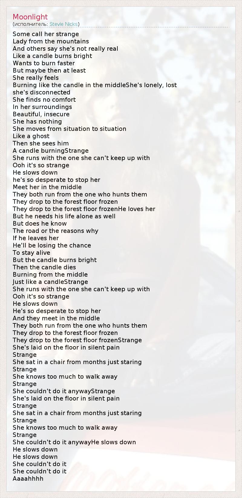 Это интересно:Стиви Никс родилась 26 мая 1948 года в Финиксе, штат Аризона, США. Она является одной из талантливейших и известнейших американских исполнительниц, обладательницей большого количества музыкальных премий и наград. Особую популярность получила благодаря работе в рамках группы Fleetwood Mac. Певица исполняет свои композиции в лирическом, но в то же самое время тяжелом стиле, тем самым создавая... продолжение