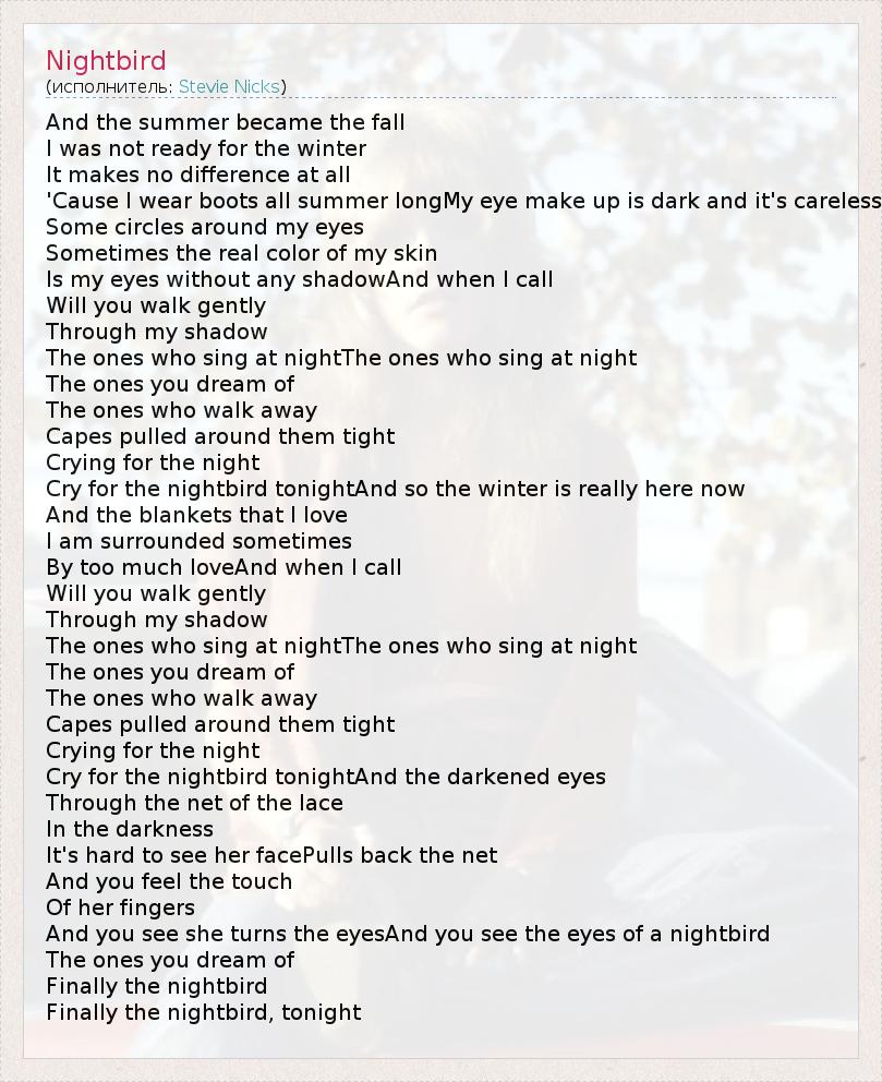And the summer became the fall I was not ready for the winter It makes no difference at all 'Cause I wear boots all summer longMy eye make up is dark and it's careless Some circles around my eyes Sometimes the real color of my skin Is my eyes without any shadowAnd when I call Will you walk gently Through my shadow The ones who sing at nightThe ones who sing at night The ones you dream of The ones who walk away Capes pulled around them tight Crying for the night Cry for the nightbird tonightAnd so the winter is really here now And the blankets that I love I am surrounded sometimes By too much loveAnd when I call Will you walk gently Through my shadow The ones who sing at nightThe ones who sing at night The ones you dream of The ones who walk away Capes pulled around them tight Crying for the night Cry for the nightbird tonightAnd the darkened eyes Through the net of the lace In the darkness It's hard to see her facePulls back the net And you feel the touch Of her fingers And you see she turns the eyesAnd you see the eyes of a nightbird The ones you dream of Finally the nightbird Finally the nightbird, tonight