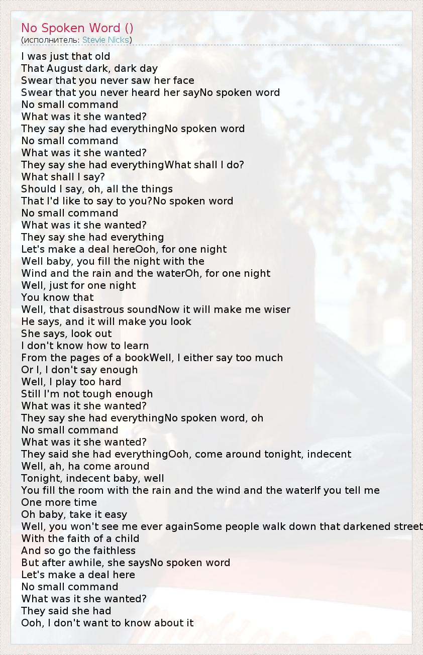 I was just that old That August dark, dark day Swear that you never saw her face Swear that you never heard her sayNo spoken word No small command What was it she wanted? They say she had everythingNo spoken word No small command What was it she wanted? They say she had everythingWhat shall I do? What shall I say? Should I say, oh, all the things That I'd like to say to you?No spoken word No small command What was it she wanted? They say she had everything Let's make a deal hereOoh, for one night Well baby, you fill the night with the Wind and the rain and the waterOh, for one night Well, just for one night You know that Well, that disastrous soundNow it will make me wiser He says, and it will make you look She says, look out I don't know how to learn From the pages of a bookWell, I either say too much Or I, I don't say enough Well, I play too hard Still I'm not tough enough What was it she wanted? They say she had everythingNo spoken word, oh No small command What was it she wanted? They said she had everythingOoh, come around tonight, indecent Well, ah, ha come around Tonight, indecent baby, well You fill the room with the rain and the wind and the waterIf you tell me One more time Oh baby, take it easy Well, you won't see me ever againSome people walk down that darkened street With the faith of a child And so go the faithless But after awhile, she saysNo spoken word Let's make a deal here No small command What was it she wanted? They said she had Ooh, I don't want to know about it