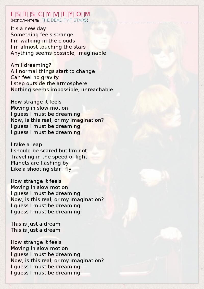 It's a new day Something feels strange I'm walking in the clouds I'm almost touching the stars Anything seems possible, imaginable Am I dreaming? All normal things start to change Can feel no gravity I step outside the atmosphere Nothing seems impossible, unreachable How strange it feels Moving in slow motion I guess I must be dreaming Now, is this real, or my imagination? I guess I must be dreaming I guess I must be dreaming I take a leap I should be scared but I'm not Traveling in the speed of light Planets are flashing by Like a shooting star I fly How strange it feels Moving in slow motion I guess I must be dreaming Now, is this real, or my imagination? I guess I must be dreaming I guess I must be dreaming This is just a dream This is just a dream How strange it feels Moving in slow motion I guess I must be dreaming Now, is this real, or my imagination? I guess I must be dreaming I guess I must be dreaming