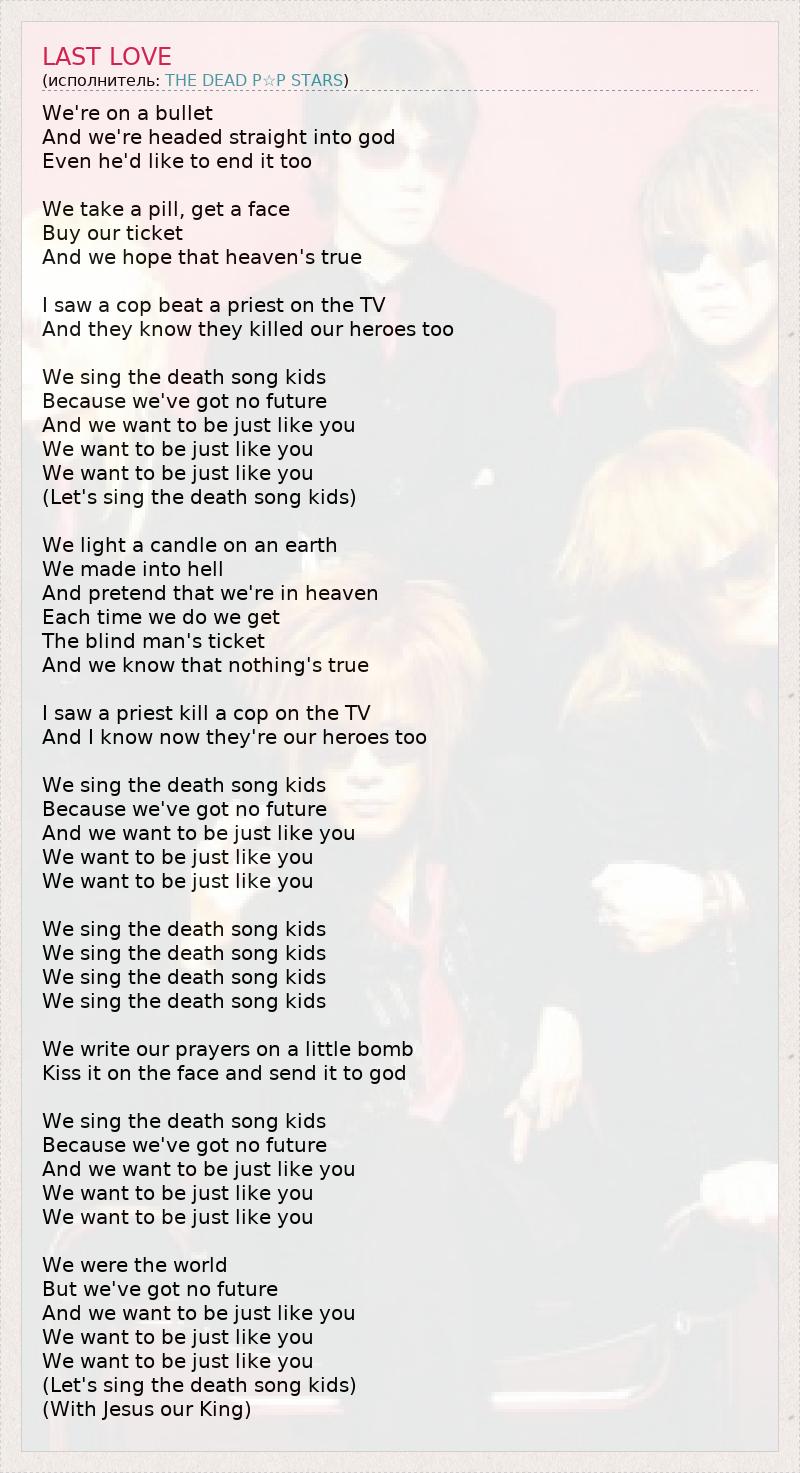 Мы на пуле И несемся прямо в бога, Даже если он тоже хочет это закончить. Мы пьем таблетку, принимаем облик, Покупаем наш билет И надеемся, что небеса и вправду существуют. Я видел по ТВ, как коп избивает священника. И они знают, что тоже убили наших героев. Мы поем песню смерти, детки, Потому что у нас нет будущего, И мы хотим быть такими же, как вы, Мы хотим быть такими же, как вы, Мы хотим быть такими же, как вы. (Давайте споем песню смерти, детки.) Мы зажигаем свечу на земле, Которую превратили в ад, И притворяемся, что мы в раю. Всякий раз при этом нам достается Кот в мешке. И мы знаем, что всё ложь. Я видел по ТВ, как священник убивает копа, И знаю, что теперь они тоже стали нашими героями. Мы поем песню смерти, детки, Потому что у нас нет будущего, И мы хотим быть такими же, как вы, Мы хотим быть такими же, как вы. Мы хотим быть такими же, как вы. Мы поем песню смерти, детки. Мы поем песню смерти, детки. Мы поем песню смерти, детки. Мы поем песню смерти, детки. Мы пишем свои молитвы на маленькой бомбе, Целуем её и посылаем богу. Мы поем песню смерти, детки, Потому что у нас нет будущего, И мы хотим быть такими же, как вы, Мы хотим быть такими же, как вы, Мы хотим быть такими же, как вы. Мы были миром, Но у нас нет будущего, И мы хотим быть такими же, как вы, Мы хотим быть такими же, как вы, Мы хотим быть такими же, как вы, (Давайте споем песню смерти, детки.) (Вместе с Иисусом, нашим Царем.)