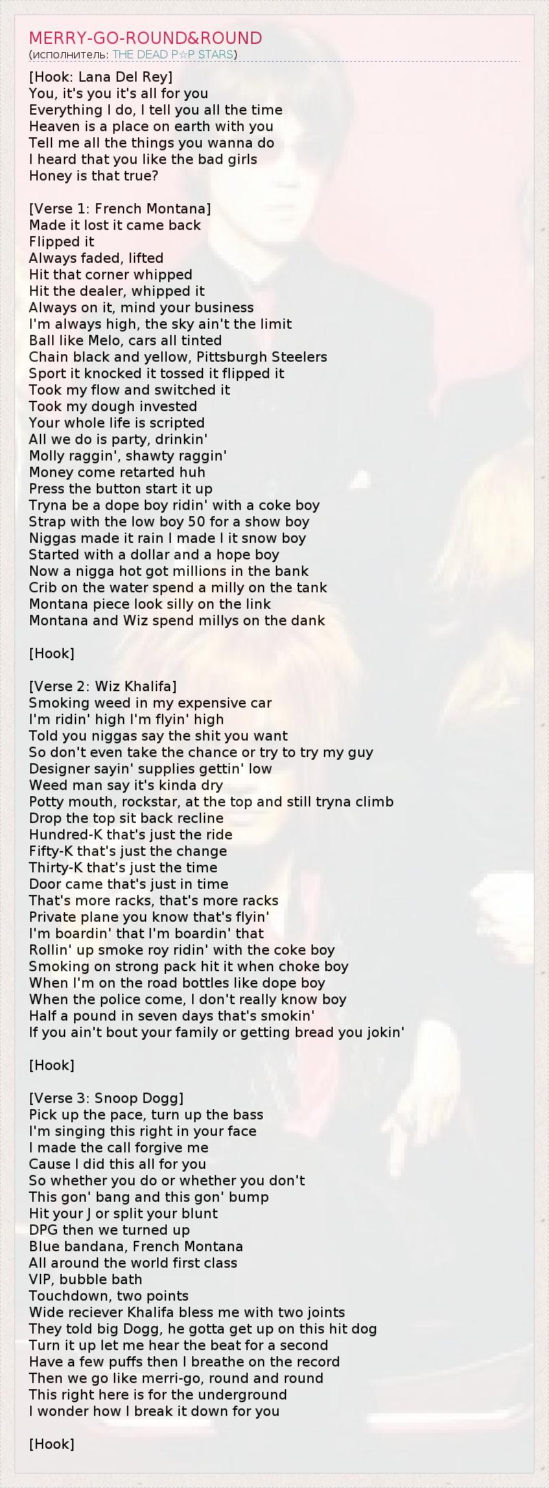 [Хук: Lana Del Rey] Ты... Это для тебя, это всё для тебя. Всё, что я делаю. Я говорю тебе об этом всё время. На Земле рядом с тобой – рай небесный. Расскажи мне обо всём, что ты хочешь сделать. Я слышала, тебе нравятся плохие девочки. Милый, это правда? [1 куплет: French Montana] Сначала я всё потерял, но потом это вернулось. Я банчил дурь. Вечно обкуренный, под кайфом, Никакой, я барыжил на углу. Я был дилером, я сам сидел на игле, Всё время в торче. А ты занимайся своим делом! Я всегда в улёте, и небо – не предел. Я бросаю, как Melo, 1 у меня тачки с тонированными стеклами. Я ношу черные и желтые цепочки, как Pittsburgh Steelers. 2 Я играл, бросал, бил, подкидывал, Брал рэп и делал с ним, что хотел, Инвестировал своё бабло. Вся ваша жизнь заранее расписана, А мы только и делаем, что тусуемся, пьем, Закидываемся экстази, развлекаемся с девочками. Деньги не спешат течь нам в руки. Нажми на старт, чтобы начать процесс. Я пытаюсь быть дилером и ношусь с коксом, парень. Всегда при пушке, парень, 50 3 за одно шоу, парень. Ниггеры по части дождя, а я по части снега, 4 парень. Я начинал с одного доллара и надежды, парень, А теперь у меня миллионы в банке, парень. У меня дом на воде, я потратил миллион на этот бассейн. Вывеска Montana глупо смотрится на цепочке. Мы с Визом 5 спустили миллионы на вещества. [Хук] [2 куплет: Wiz Khalifa] Курю травку в своей дорогущей тачке И угораю, и улетаю. Я говорил вам, ниггеры, скажите, какого х*на вам надо? Даже не пытайтесь быть похожими на меня. Обманщик говорит, что запасов становится меньше, Поставщик травки говорит, что настала засуха, А похабник-рокстар на самом верху и карабкается еще выше. Откинул крышу и сам откинулся. 100 километров – как нечего делать. 50 косарей – просто сдача. 30 кусков – всего лишь время. 6 Дверь открылась как раз вовремя, Еще больше стопок, еще больше стопок... Частный самолет... Знаете, он ещё и летает. Я иду на посадку, иду на посадку. Сворачиваю косяк, рассекаю на Ройсе с коксом, парень. Только высокосортная дурь. Затянись, когда прижмёт, парень. Когда я в дороге, бутылки для меня – вместо допинга, парень, И я сам не знаю, в какой момент нагрянут копы, парень. Я выкуриваю полфунта в неделю. 7 Если вы не о своей семье или не о бабле, то вы шутите. [Хук] [3 куплет: Snoop Dogg] Прибавь темп, вруби бас, Я пою тебе это прямо в лицо. Я звонил тебе, прости, Ведь я делал всё это только для тебя. Поэтому, хочешь ты или не хочешь, Всё полетит к ч*ртям. Скрути джойнт или забей косяк. 8 DPG, 9 мы явились. Блю-банана, French Montana. Признанные всеми, первый класс, VIP, ванна с пузырьками. Тачдаун, двухочковый, Халифа, принимающий, 10 благослови меня двумя косяками. Говорят, большой Dogg имеет виды на этот хит, собака такая. Включите-ка его, дайте я немного послушаю его ритм. Я затянусь пару раз перед тем, как вдохну жизнь в эту запись, А потом мы начнем, как Merry-Go-Round. 11 Это для андеграунда. Я сам удивляюсь, что это я тут для вас расстарался... [Хук] 1 – Кармело Энтони – американский баскетболист, игрок команды "Нью-Йорк Никс". 2 – Питтсбург Стилерз – профессиональный футбольный клуб из Питтсбурга. Его эмблема включает в себя черный, желтый и белый цвета. 3 – Имеется в виду сумма в 50 000 долларов, которую French Montana просит за одно выступление. 4 – French Montana имеет в виду, что торгует кокаином. 5 – Имеется в виду Виз Халифа. 6 – Виз Халифа имеет в виду, что его часы стоят 30 000 долларов. 7 – Виз неоднократно упоминал в своих текстах, что спосо