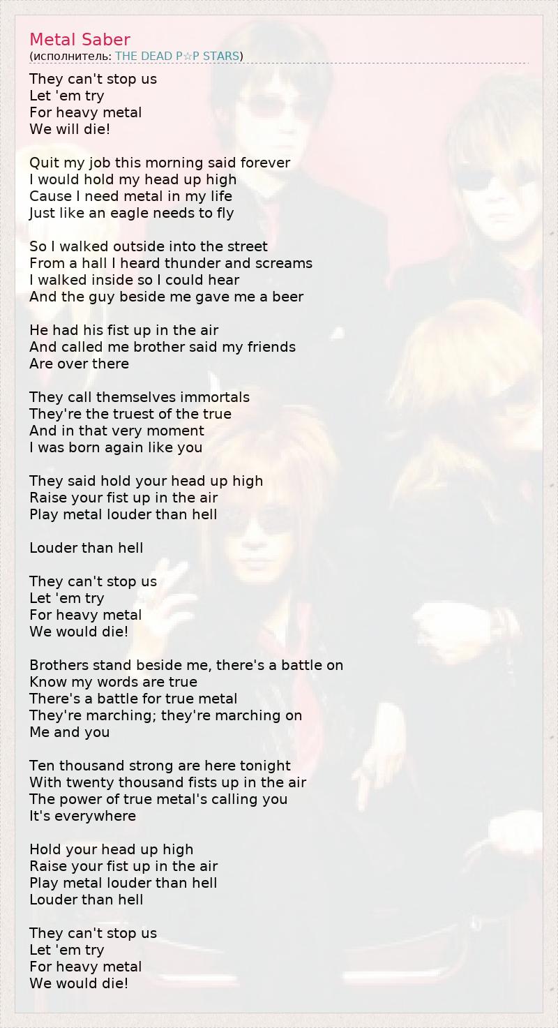 Им нас не остановить - Пускай попробуют. За Хэви Метал Мы умрем! Этим утром я ушел со своей работы, сказав: "Я всегда Буду держать свою голову высоко поднятой", Потому что в моей жизни мне нужен Метал, Как Орлу нужно летать. И я вышел на улицу. Я услышал гром и крики, доносящиеся из холла. Я вошел, чтобы послушать, И парень, который стоял рядом, дал мне пиво. Его кулак был высоко поднят, Он назвал меня братом, сказал, мои друзья Уже все там. Они называют себя бессмертными, И они правы как никто другой. И именно в этом момент Я будто родился заново, как ты. Мне сказали, держи выше голову, Подними вверх кулак. И играй Метал громче, чем в аду! Громче, чем в аду! Им нас не остановить - Пускай попробуют. За Хэви Метал Мы умрем! Братья, встаньте рядом со мной - будет битва, Вы знаете, я говорю правду. Это битва за настоящий Метал, Маршируют, идут против Тебя и меня. Сегодня ночью, здесь наши силы составляют десять тысяч человек, А это двадцать тысяч кулаков, поднятых вверх. Мощь настоящего Метала взывает к тебе, Она везде. Держи выше голову, Подними вверх кулак. И играй Метал громче, чем в аду! Громче, чем в аду! Им нас не остановить - Пускай попробуют. За Хэви Метал Мы умрем!