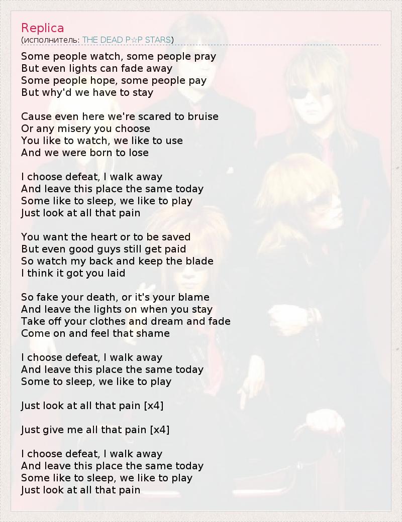 Some people watch, some people pray But even lights can fade away Some people hope, some people pay But why'd we have to stay Cause even here we're scared to bruise Or any misery you choose You like to watch, we like to use And we were born to lose I choose defeat, I walk away And leave this place the same today Some like to sleep, we like to play Just look at all that pain You want the heart or to be saved But even good guys still get paid So watch my back and keep the blade I think it got you laid So fake your death, or it's your blame And leave the lights on when you stay Take off your clothes and dream and fade Come on and feel that shame I choose defeat, I walk away And leave this place the same today Some to sleep, we like to play Just look at all that pain [х4] Just give me all that pain [х4] I choose defeat, I walk away And leave this place the same today Some like to sleep, we like to play Just look at all that pain