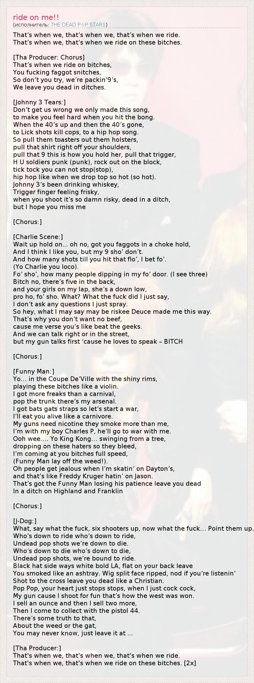That’s when we, that’s when we, that’s when we ride. That’s when we, that’s when we ride on these bitches. [Tha Producer: Сhorus] That’s when we ride on bitches, You fucking faggot snitches, So don’t you try, we’re packin’9’s, We leave you dead in ditches. [Johnny 3 Tears:] Don’t get us wrong we only made this song, to make you feel hard when you hit the bong. When the 40’s up and then the 40’s gone, to Lick shots kill cops, to a hip hop song. So pull them toasters out them holsters, pull that shirt right off your shoulders, pull that 9 this is how you hold her, pull that trigger, H U soldiers punk (punk), rock out on the block, tick tock you can not stop(stop), hip hop like when we drop top so hot (so hot). Johnny 3’s been drinking whiskey, Trigger finger feeling frisky, when you shoot it’s so damn risky, dead in a ditch, but I hope you miss me [Сhorus:] [Charlie Scene:] Wait up hold on... oh no, got you faggots in a choke hold, And I think I like you, but my 9 sho’ don’t. And how many shots till you hit that flo’, I bet fo’. (Yo Charlie you loco). Fo’ sho’, how many people dipping in my fo’ door. (I see three) Bitch no, there’s five in the back, and your girls on my lap, she’s a down low, pro ho, fo’ sho. What? What the fuck did I just say, I don’t ask any questions I just spray. So hey, what I may say may be riskee Deuce made me this way. That’s why you don’t want no beef, cause me verse you’s like beat the geeks. And we can talk right or in the street, but my gun talks first ‘cause he loves to speak – BITCH [Сhorus:] [Funny Man:] Yo… in the Coupe De’Ville with the shiny rims, playing these bitches like a violin. I got more freaks than a carnival, pop the trunk there’s my arsenal. I got bats gats straps so let’s start a war, I’ll eat you alive like a carnivore. My guns need nicotine they smoke more than me, I’m with my boy Charles P, he’ll go to war with me. Ooh wee…. Yo King Kong… swinging from a tree, dropping on these haters so they bleed, I’m coming at you bitches full speed, (Funny Man lay off the weed!). Oh people get jealous when I’m skatin’ on Dayton’s, and that’s like Freddy Kruger hatin’ on Jason. That’s got the Funny Man losing his patience leave you dead In a ditch on Highland and Franklin [Сhorus:] [J-Dog:] What, say what the fuck, six shooters up, now what the fuck… Point them up. Who’s down to ride who’s down to ride, Undead pop shots we’re down to die. Who’s down to die who’s down to die, Undead pop shots, we’re bound to ride. Black hat side ways white bold LA, flat on your back leave You smoked like an ashtray. Wig split face ripped, nod if you’re listenin’ Shot to the cross leave you dead like a Christian. Pop Pop, your heart just stops stops, when I just cock cock, My gun cause I shoot for fun that’s how the west was won. I sell an ounce and then I sell two more, Then I come to collect with the pistol 44. There’s some truth to that, About the weed or the gat, You may never know, just leave it at ... [Tha Producer:] That's when we, that's when we, that's when we ride. That's when we, that's when we ride on these bitches. [2x]