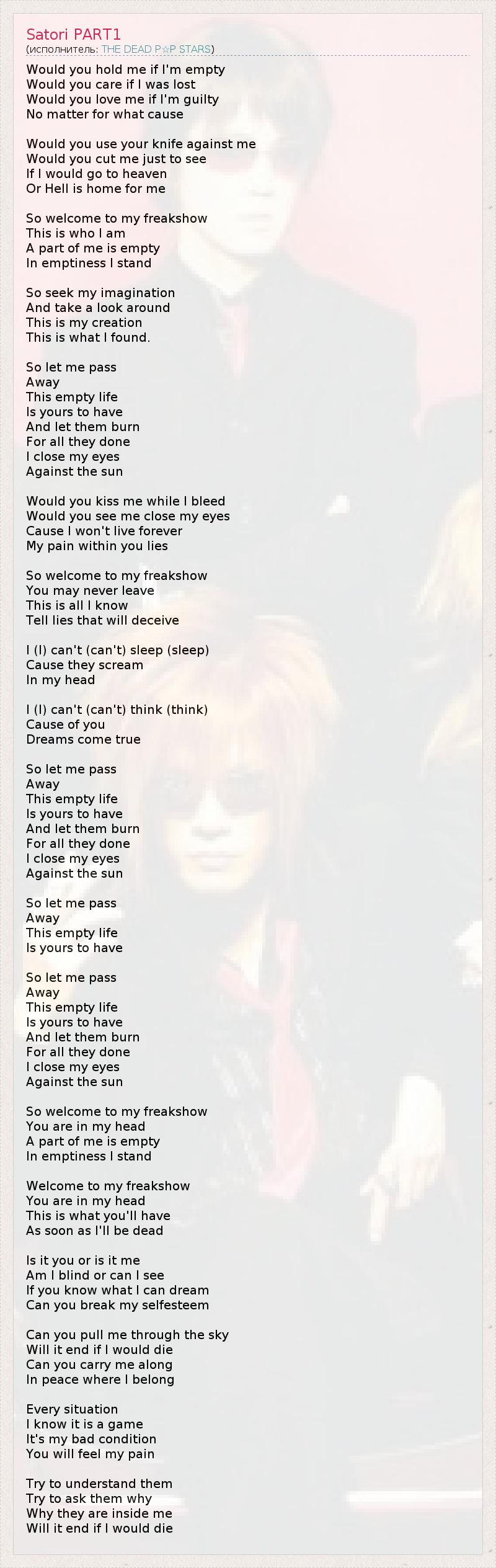 Ты бы поддержала меня, если бы я был пуст? Тебе было бы дело, если я бы был потерян? Ты бы любила меня, когда я виновен, Независимо от того, по какой причине? Использовала бы ты свой нож против меня? Зарезала бы ты меня только, чтобы увидеть, Отправлюсь ли я в рай Или Ад - мой дом? Так добро пожаловать в мой цирк уродов, Именно такой я и есть. Часть меня - пустота, И я стою в пустоте Так стремись к моему воображению И обернись вокруг, Это - мое творение, Это то, что я нашел. Так дай мне Уйти, Эта пустая жизнь - Твоя теперь, И пускай они горят За все сделанное. А я закрываю глаза От солнца. Поцеловала бы ты меня, когда я истекаю кровью? Увидела бы, как я закрываю глаза? Ведь я не буду жить вечно, Моя боль - в тебе Так добро пожаловать в мой цирк уродов, Ты можешь никогда не уйти, Это все, что я умею - Произносить ложь, что [всех] обманет. Я (я) не могу (не могу) спать (спать), Потому что они кричат У меня в голове Я (я) не могу (не могу) думать (думать) Потому что благодаря тебе Мечты сбываются. Так дай мне Уйти, Эта пустая жизнь - Твоя теперь, И пускай они горят За все сделанное. А я закрываю глаза От солнца. Так дай мне Уйти, Эта пустая жизнь - Твоя теперь Так дай мне Уйти, Эта пустая жизнь - Твоя теперь, И пускай они горят За все сделанное. А я закрываю глаза От солнца. Так добро пожаловать в мой цирк уродов, Ты сейчас у меня в голове. Часть меня - пустота, И я стою в пустоте. Так добро пожаловать в мой цирк уродов, Ты сейчас у меня в голове. Это все, что станет твоим, Как только я умру. Это ты или я? Слеп я или могу видеть? Если ты знаешь, что я могу мечтать, Можешь ли ты сломать мою самооценку? Ты можешь тянуть меня по небу. Закончится ли это с моей смертью? Можешь ли ты привести меня К покою, которому я принадлежу? В любом случае Я знаю, что это игра. Это мое плохое состояние. Ты будешь чувствовать мою боль. Попробуй понять их, Попробуй спросить их "Почему?" Почему они внутри меня? Закончится ли это с моей смертью?